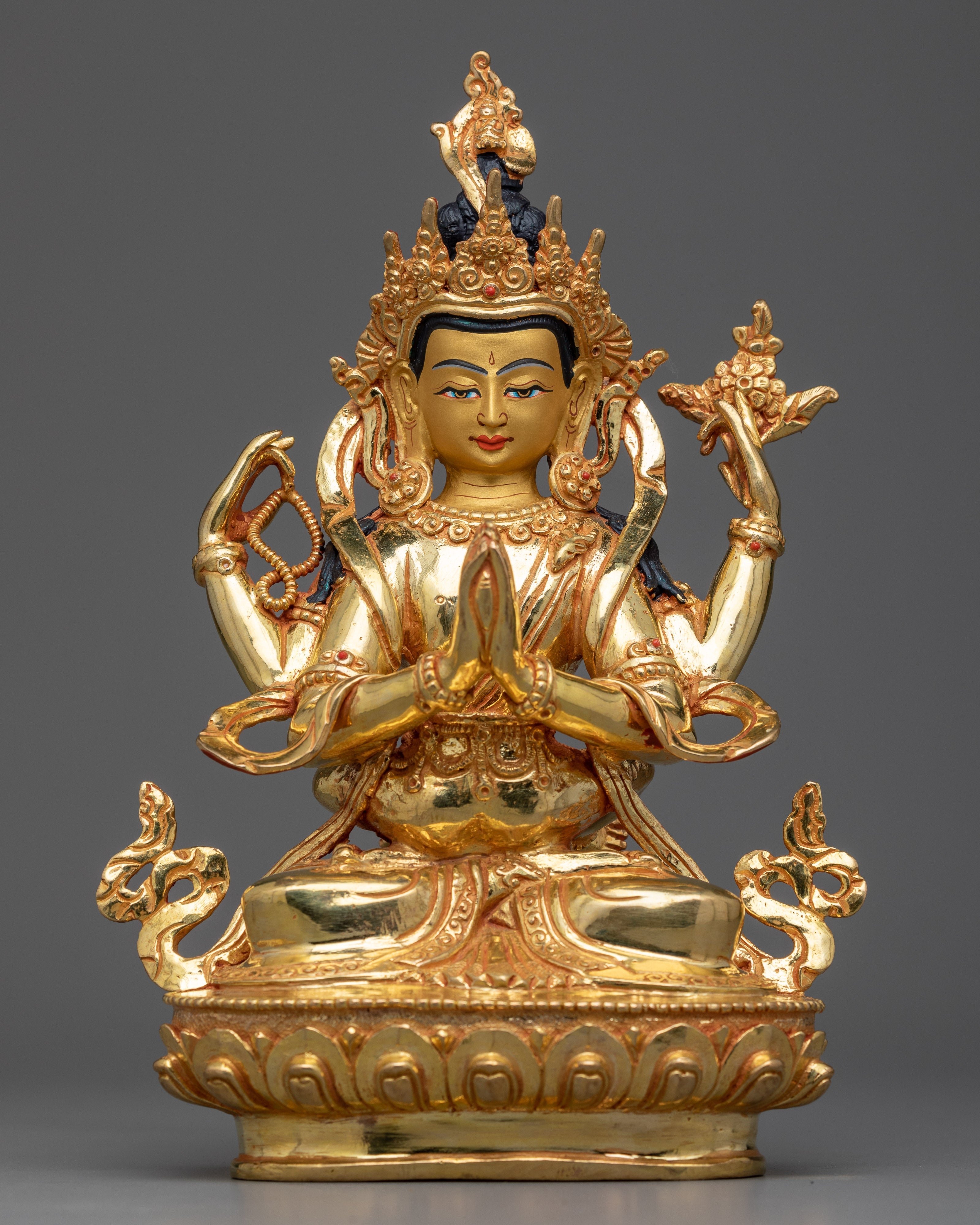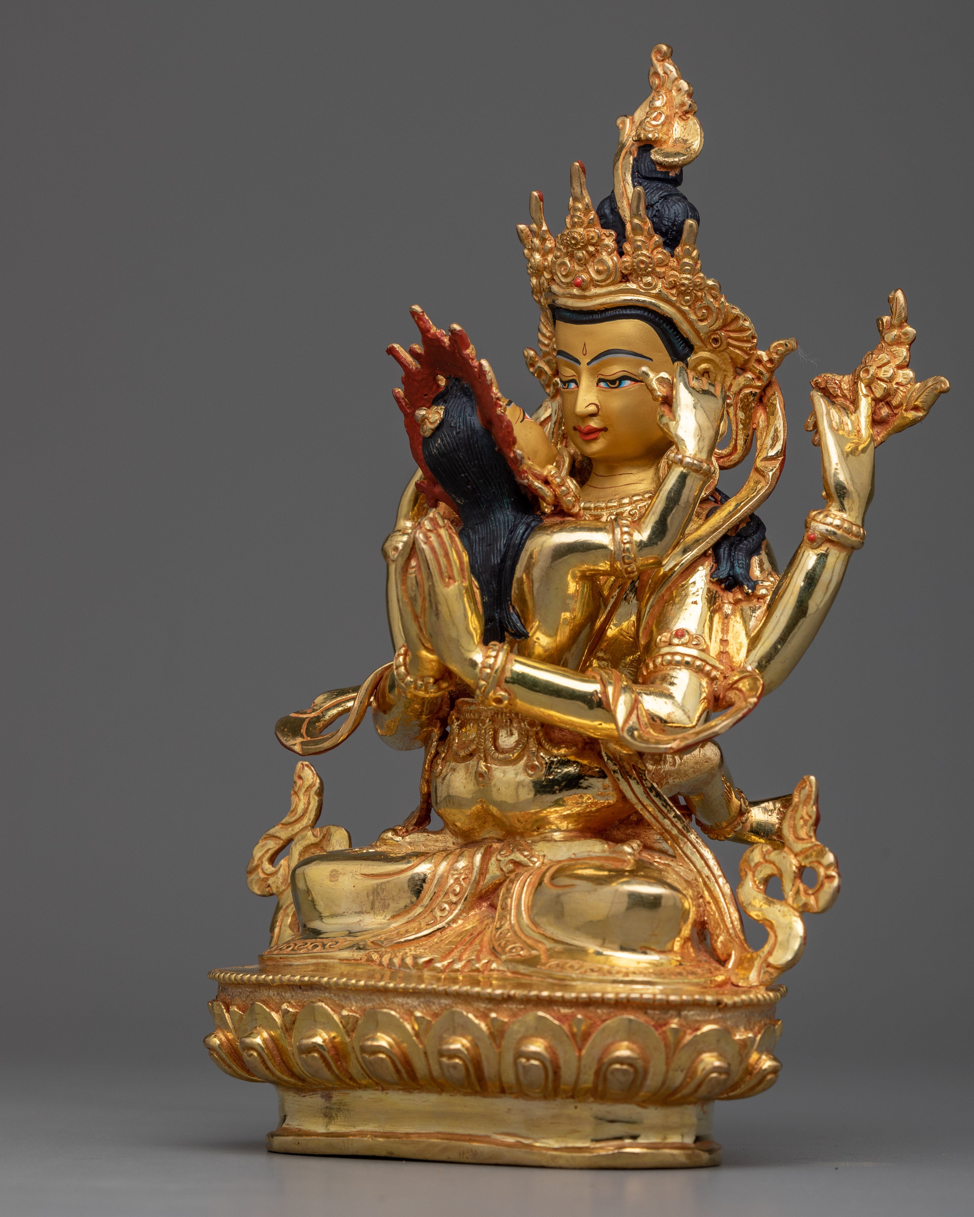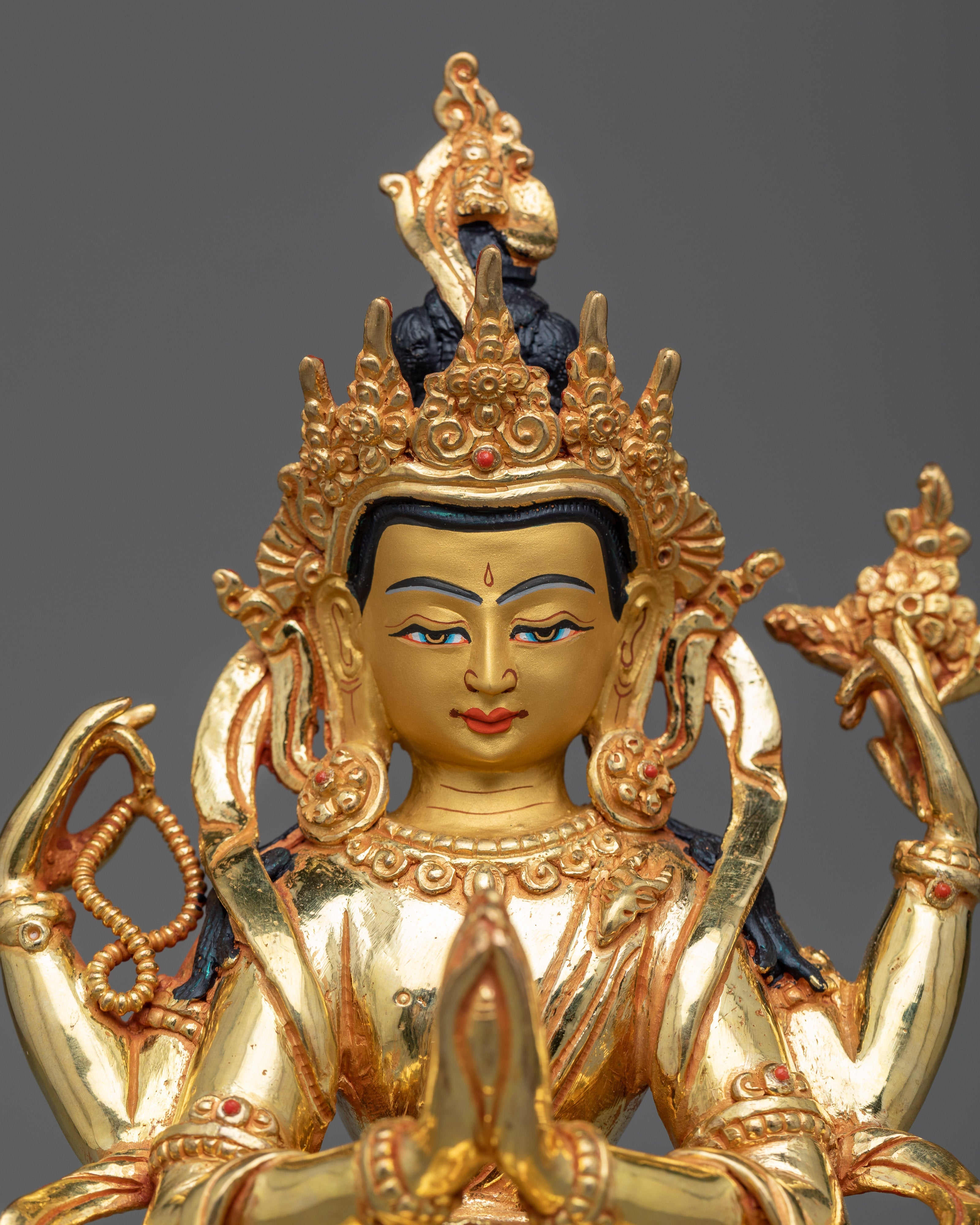 Chenrezig, also known as Avalokiteshvara, is the Buddhist deity who represents compassion. When shown with his consort, the image represents the harmonious combination of compassion (Chenrezig) and wisdom (Consort). They embody the essential principles of Buddhist teachings by teaching the significance of balancing compassion and wisdom. This statue reminds us of the connectivity of all things, as well as the heavenly dance of love and understanding.