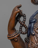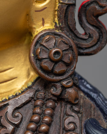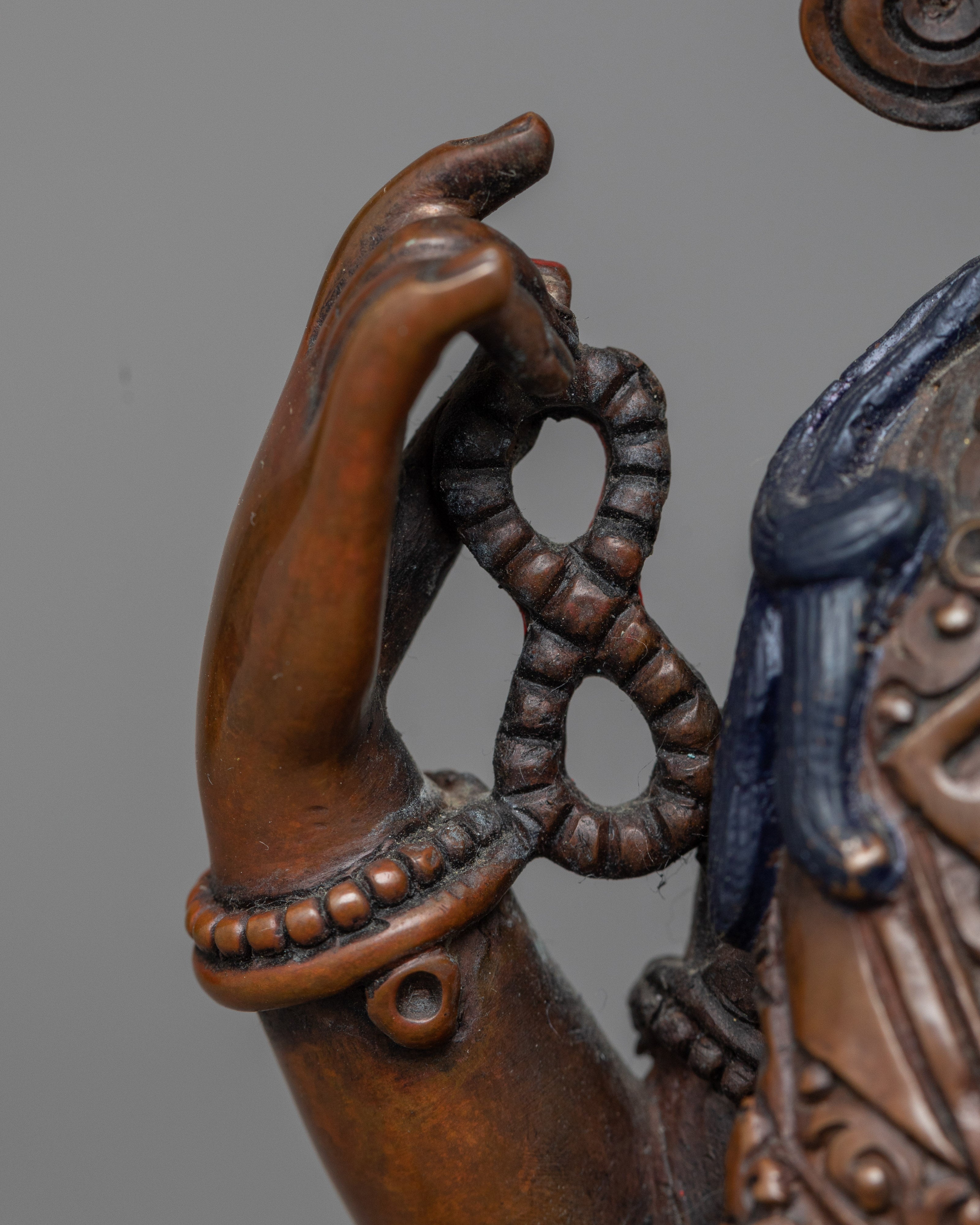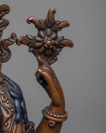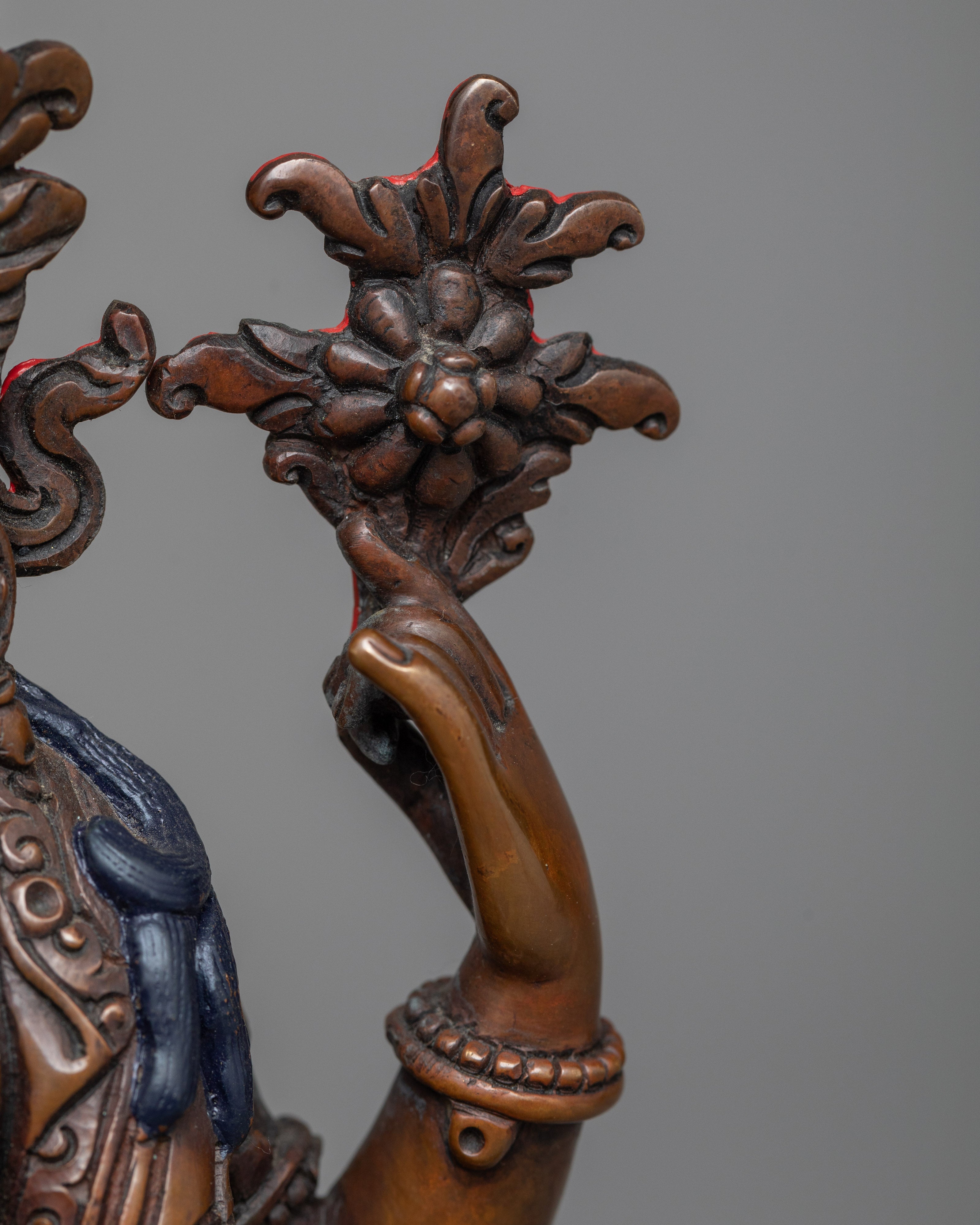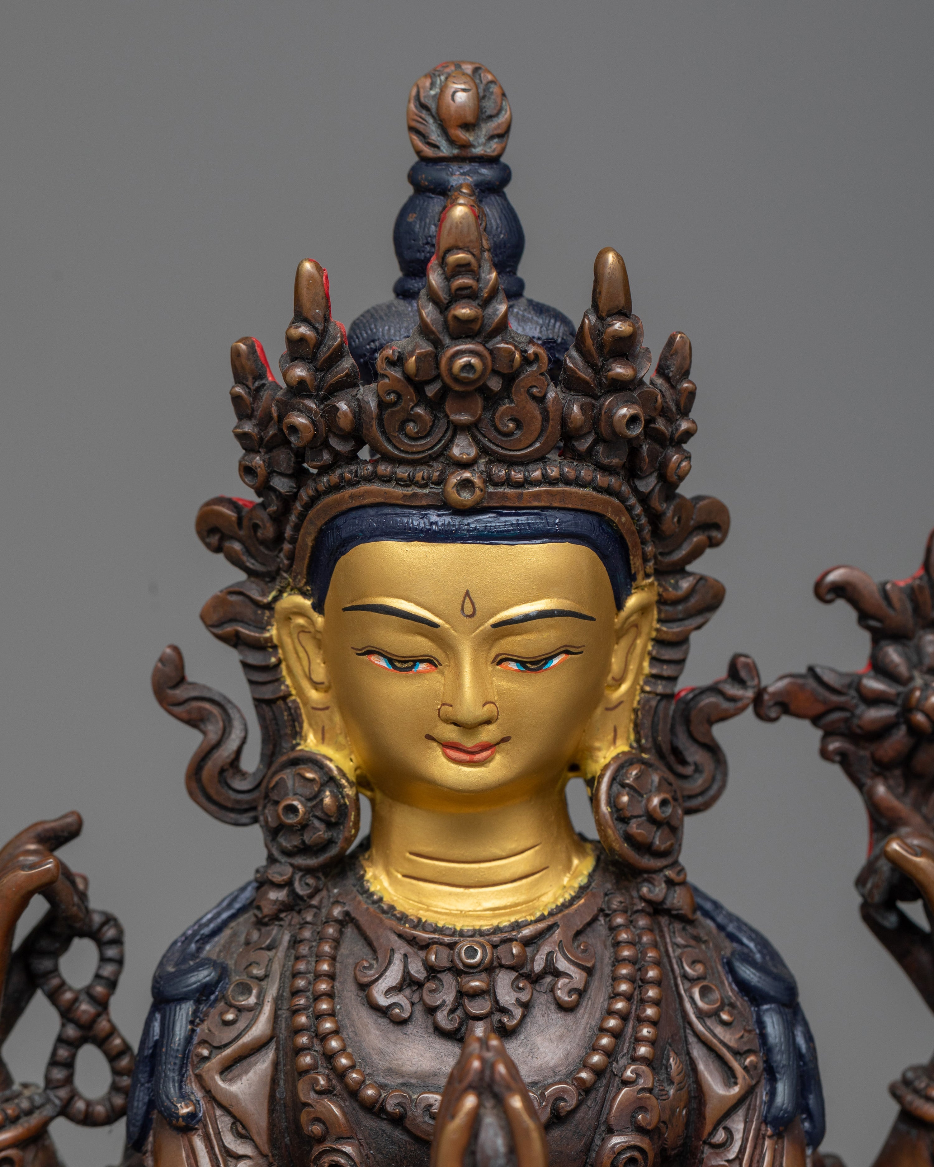 The statue is expertly crafted with an oxidized copper body, giving it a classic look. The oxidization technique adds depth and texture to the sculpture, emphasizing the delicate gold and acrylic paintings that cover Chenrezig's serene expression.