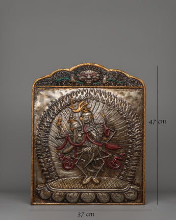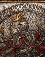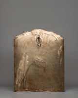 This Chitipati Wall Hanging Decor is crafted from iron and silver plating, showcasing a remarkable fusion of artistic detail and spiritual symbolism. At the top, a wrathful Kirtimukha is carved, symbolizing the power of protection and divine energy. The Chitipati takes center stage, depicted in an intricate dancing posture atop a conch shell and cowry shell, symbolizing the transience of life and the continuous cycle of death and rebirth. Their dynamic stance and skeletal form highlight the impermanence of existence, a key concept in Buddhist philosophy.