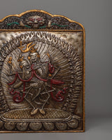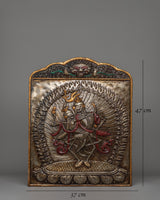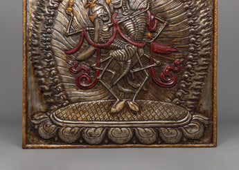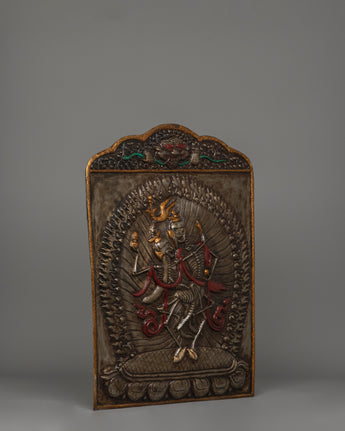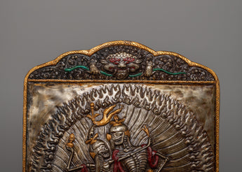 Surrounding the Chitipati is a flaming halo, radiating powerful energy and spiritual purification. They rest upon a sun disc lotus seat, representing enlightenment and transforming opposing forces into wisdom. The finely detailed carvings and ritual objects held by the Chitipati add depth and mysticism, making this piece a decorative element and a powerful symbol of spiritual awareness and the journey toward liberation. This wall hanging is both an artistic and religious artifact, perfect for enhancing any sacred space.