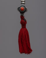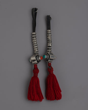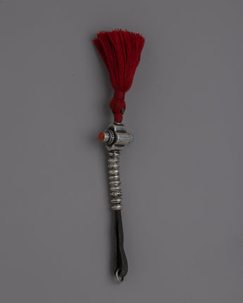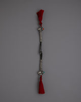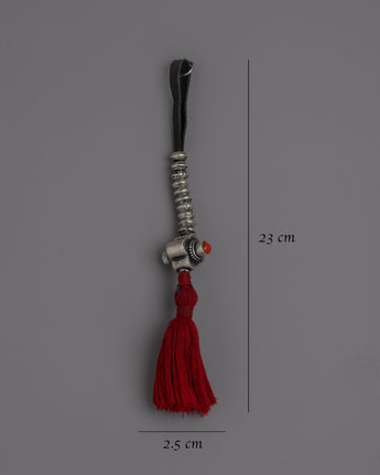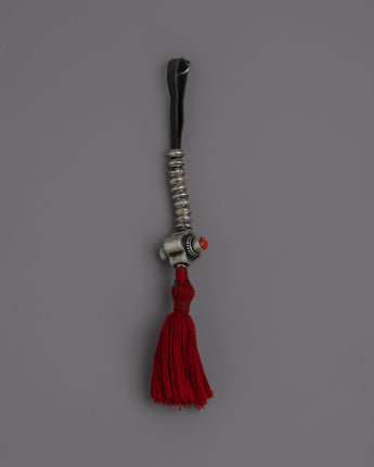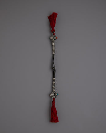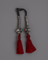 Presenting the Chupsel Tibetan Mala Counter, an exquisitely made piece of jewelry that blends conventional artistry with useful practicality. This sophisticated mala counter, which weighs only 0.094 kg and has dimensions of 23 cm in height by 2.5 cm in breadth, is made of fine silver and fabric. This mala counter is an important instrument for meditation and prayer because of its exquisite craftsmanship and detailed detailing, which are a reflection of the rich cultural legacy and spiritual practices of Tibetan Buddhism.