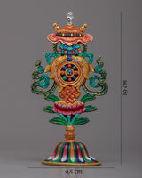 Celebrate the vibrancy of spirituality with this Colorful Auspicious Symbol, meticulously handcrafted on the brass body. Eight auspicious symbols, each carrying its own unique significance, are beautifully united in this single Brass body. The brilliant array of colors adorns the symbols, enhancing their allure and evoking a sense of joy and positivity. Standing tall at 19cm, this exquisite creation serves as a powerful reminder of the auspicious energies surrounding you. Let the captivating beauty of this handcrafted treasure inspire you on your spiritual journey and illuminate your path with happiness and prosperity.