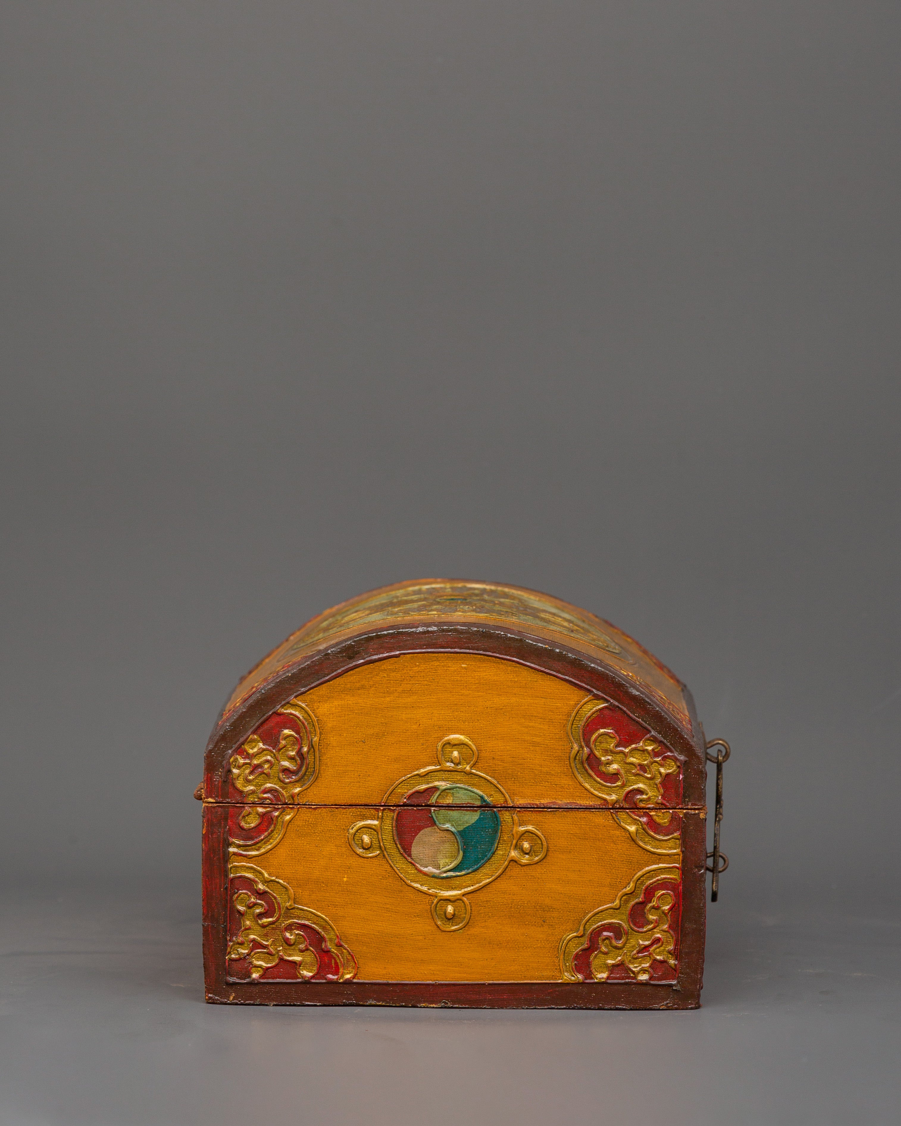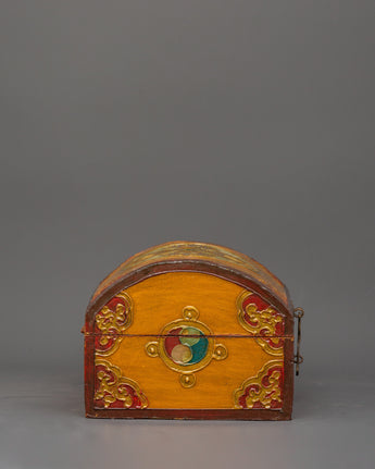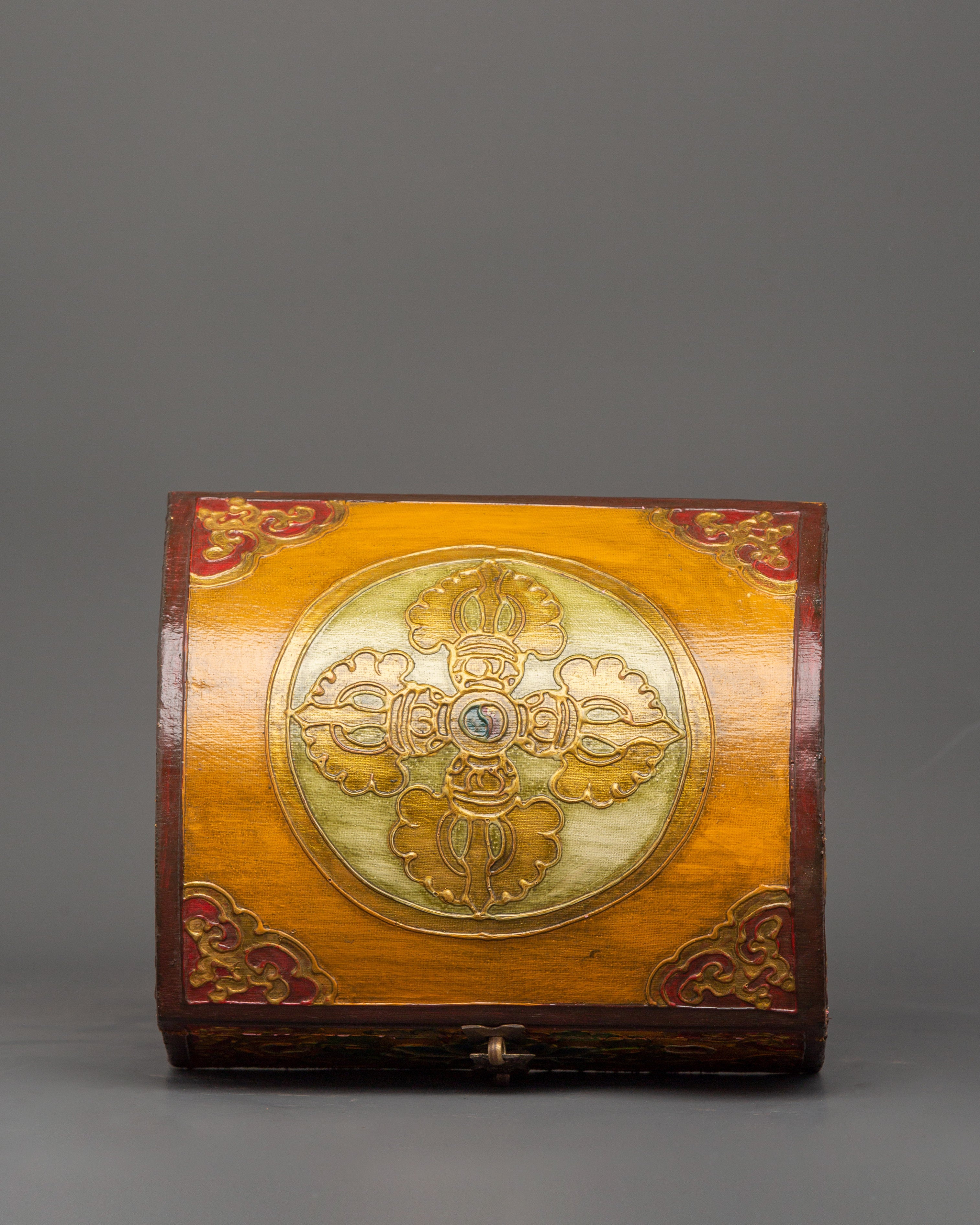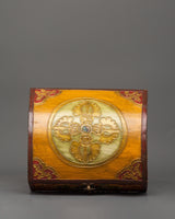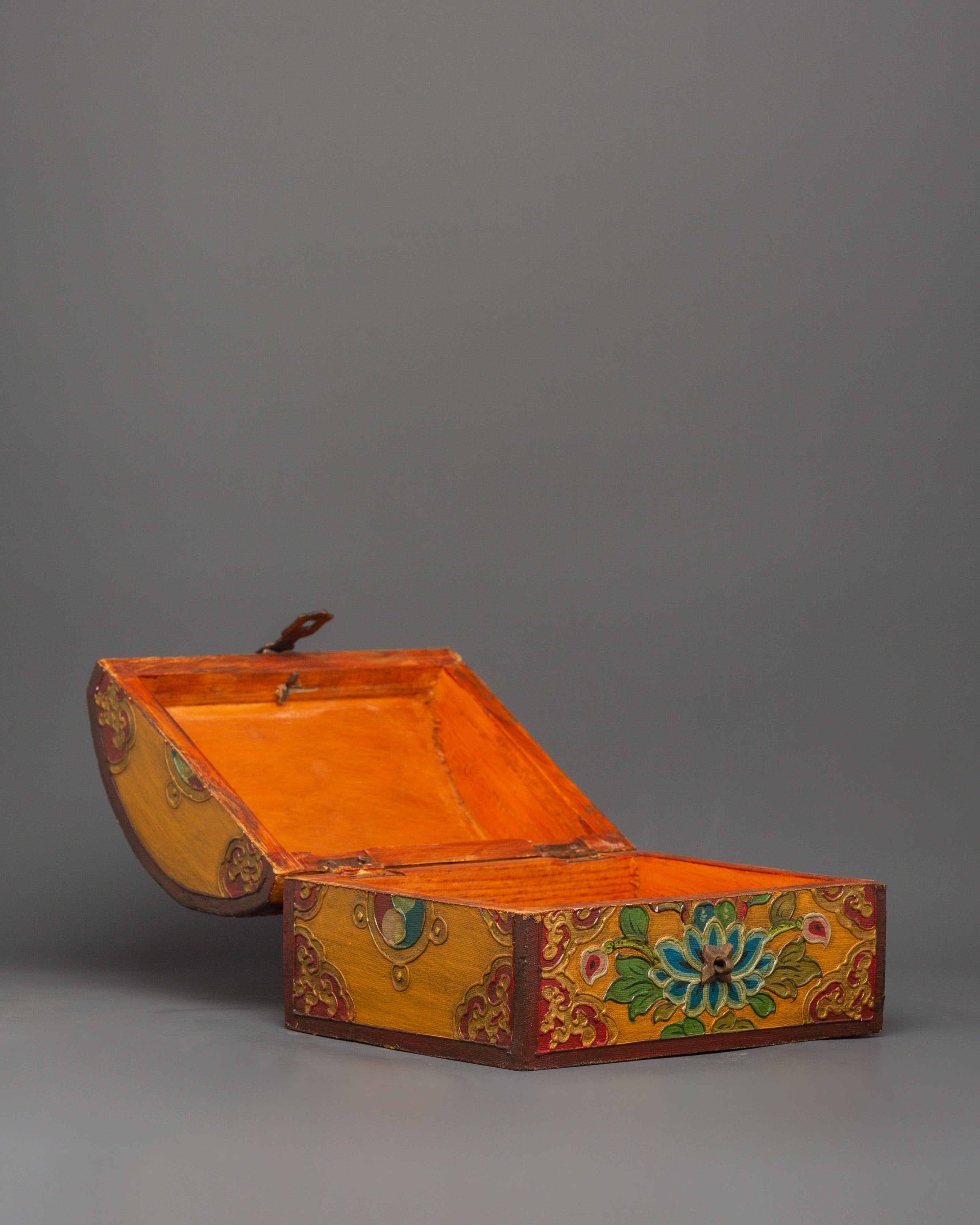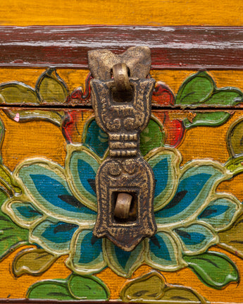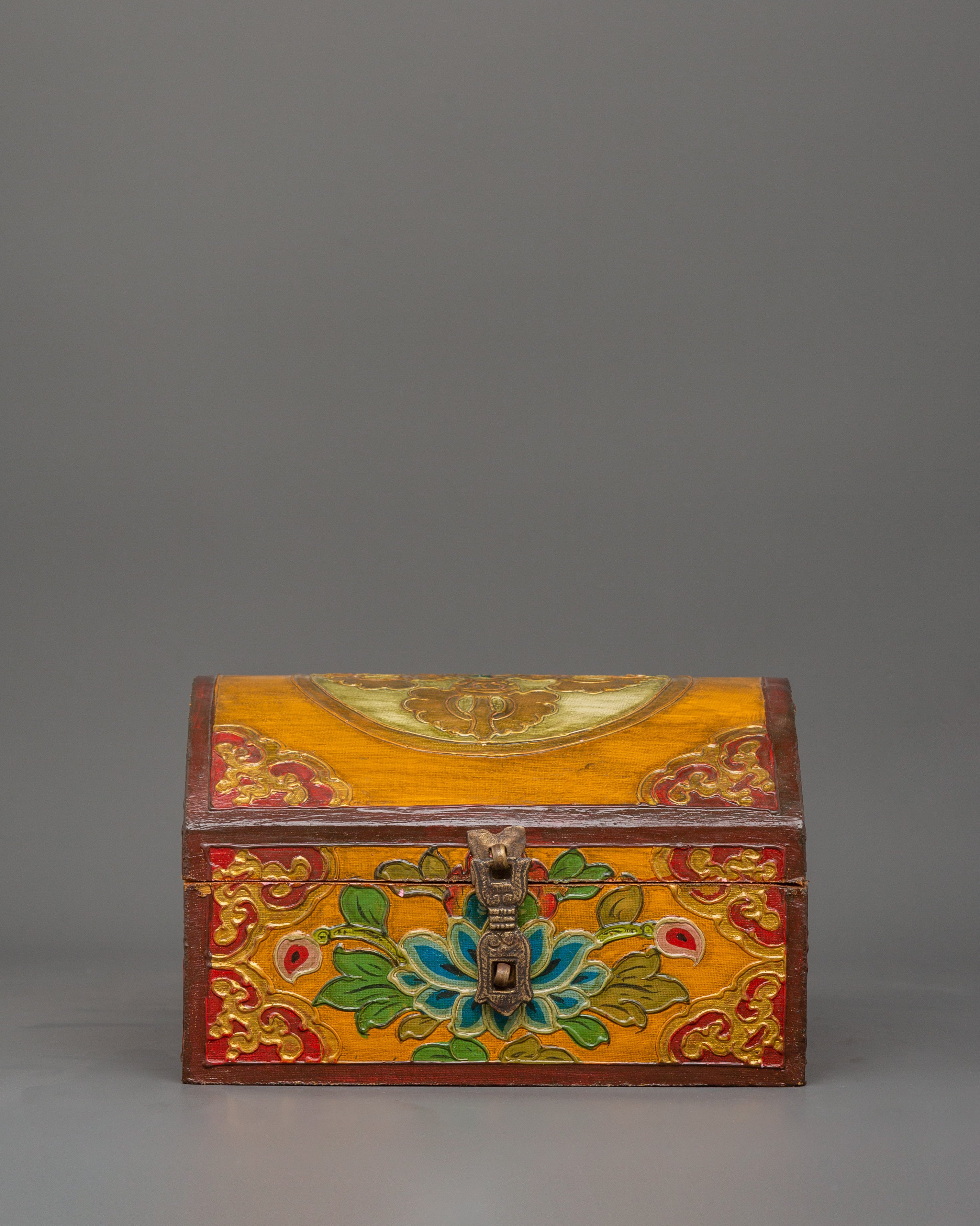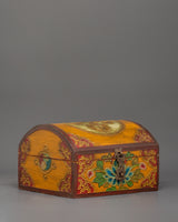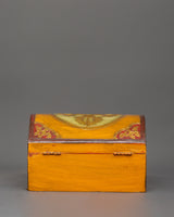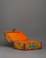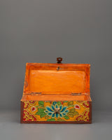 The box, which is made of wood and hand-painted with vibrant acrylic colors, is embellished with elaborate flower borders and religious symbols. In Tibetan Buddhism, the lotus in the center is a potent symbol of the spiritual path since it emerges unstained from the obstructions, just like wisdom does from difficulties in the material world. The lid is kept in place by a metal clasp, making it useful and ornamental.