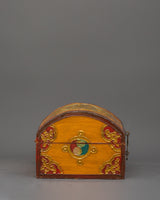 The hand-painted lotus flower motif on this colorful Tibetan wooden storage box, representing purity, awakening, and spiritual extension, is a stunning example of Himalayan artistry. This box enhances any environment with warmth and cultural appeal according to its bent top and striking use of traditional yellow, red, and green hues. It weighs 0.61 kg and is the ideal size for holding presents, jewels, keepsakes, and prayer objects. It is 11.5 cm in height and 18 cm in width.