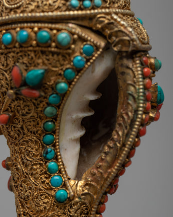 Conch Shell is utilized as a trumpet or offertory vessel in Buddhist worship and represents Buddha's spoken speech. It is one of the eight fortunate Buddhist symbols, representing the triumph of Buddha's teachings, which spread omnidirectionally like the sound of a conch shell. The conch shell is a symbol of strength, authority, and sovereignty; its sound is said to drive away evil spirits, avoid natural calamities, and scare away deadly creatures.