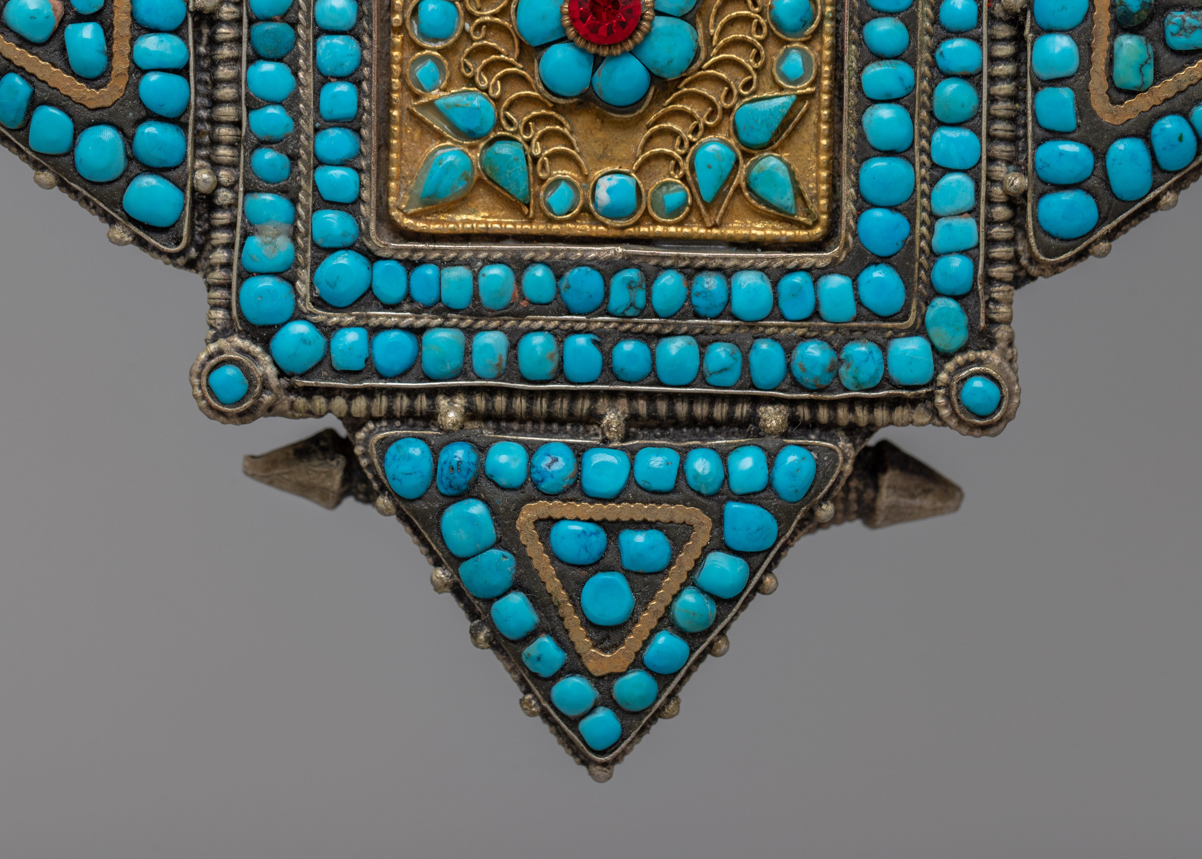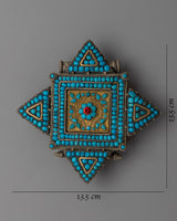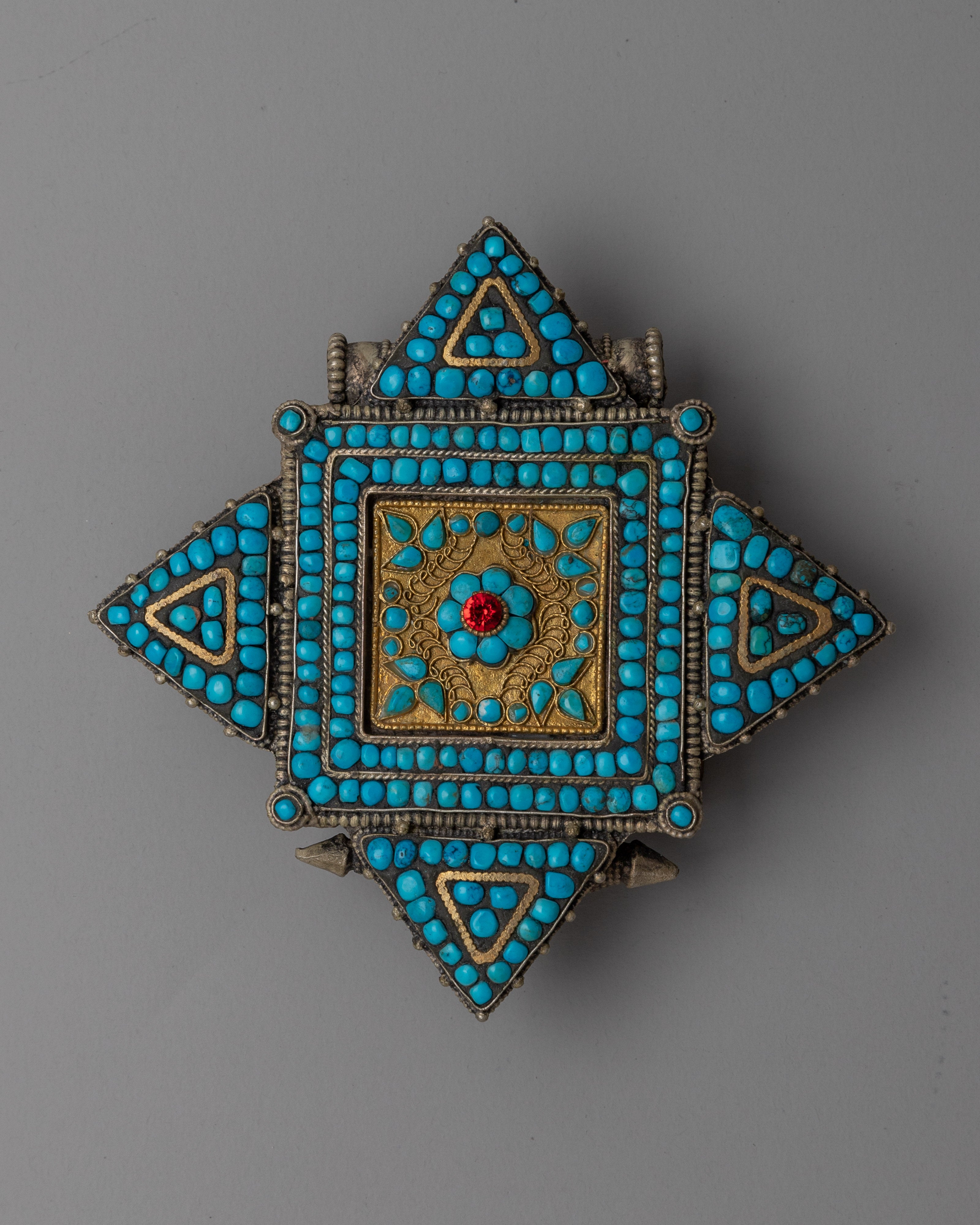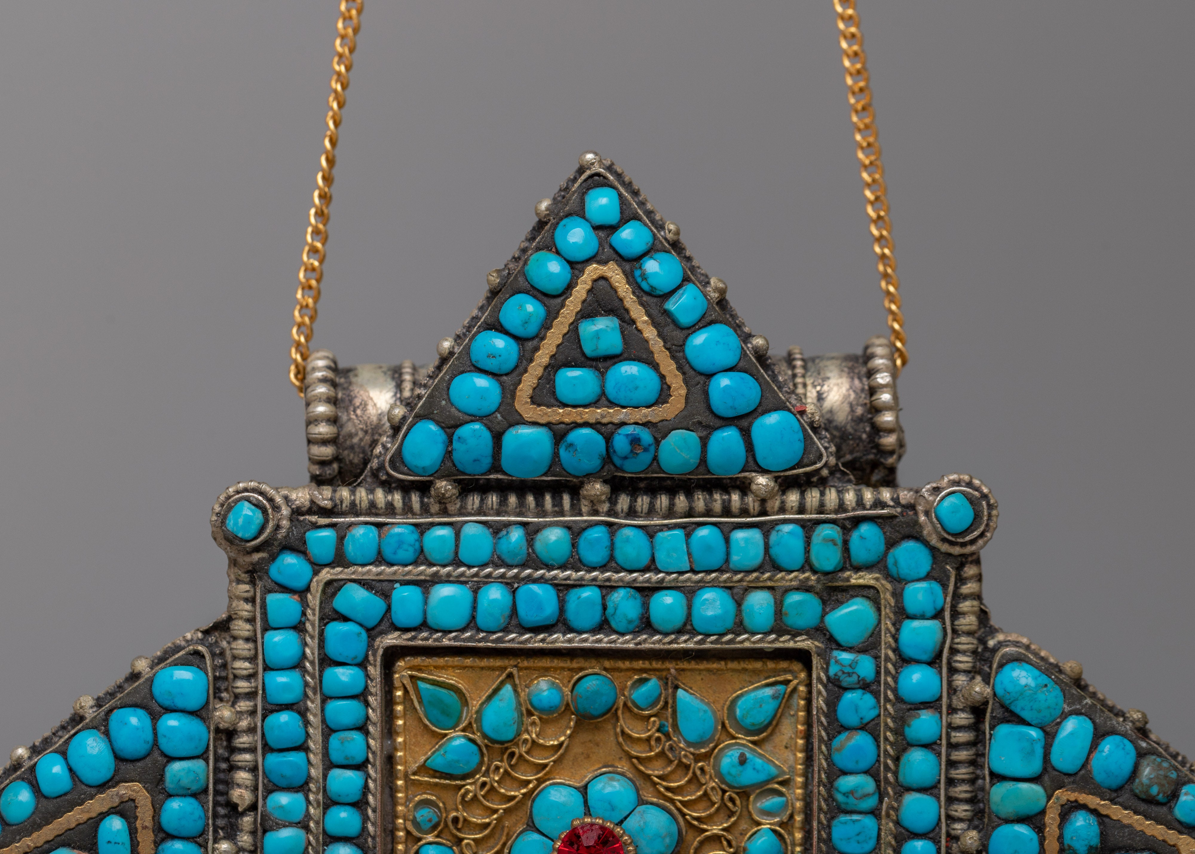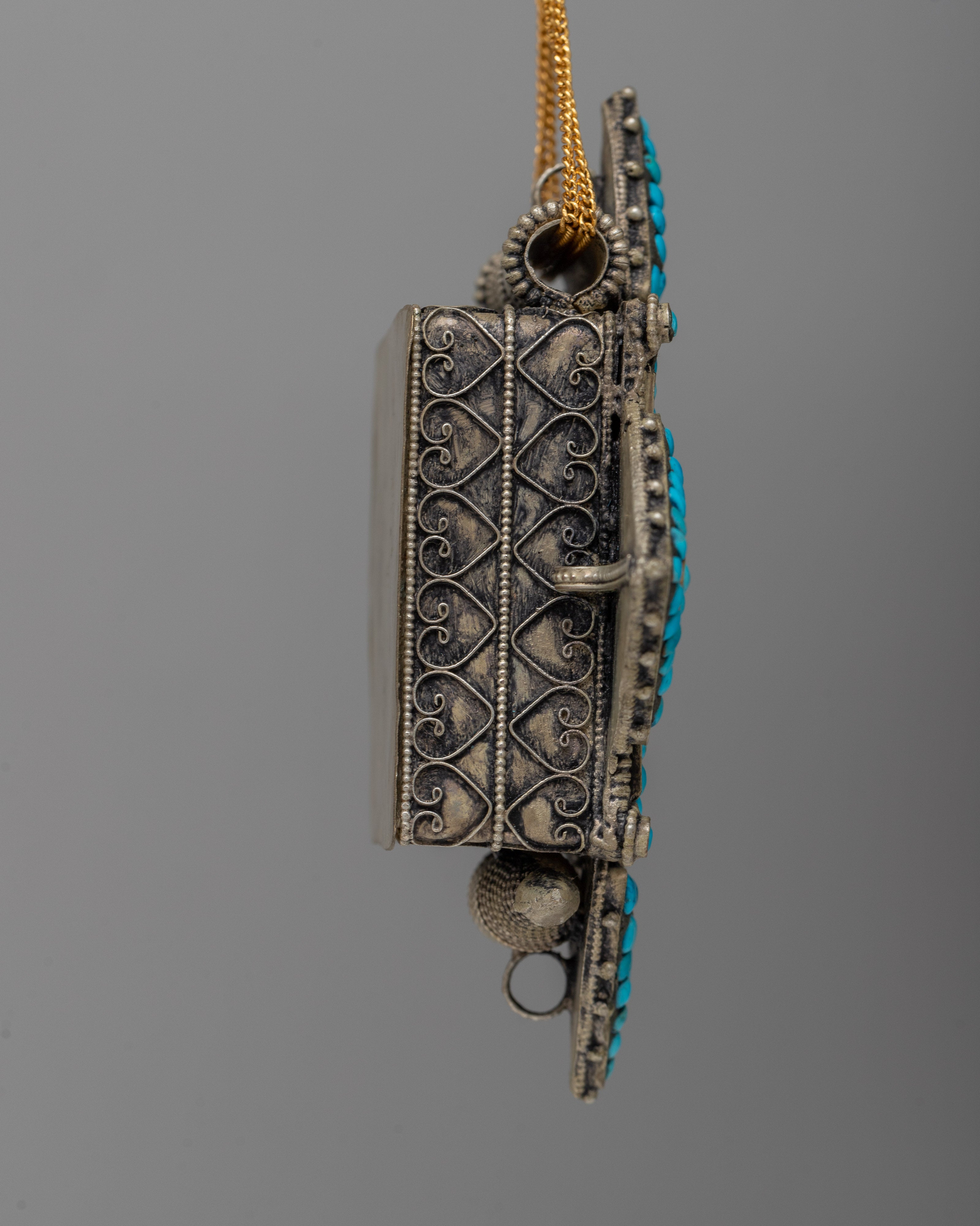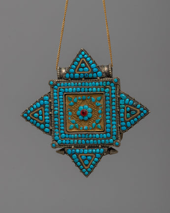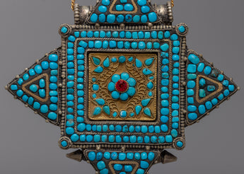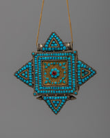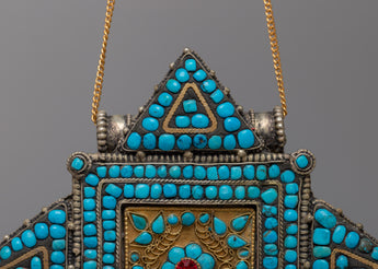 Embedded throughout the copper body are genuine turquoise and coral stones, expertly inlaid by artists to invoke the blessings of protection and direction. Each stone has its own distinct energy, imbuing the pendant with a deep sense of spirituality and reverence. As a symbol of spiritual dedication, this ghau pendant serves as a concrete reminder of the sacred path and the never-ending quest for enlightenment. Our Consecrated Ghau Pendant celebrates Tibetan tradition's spiritual depth and cultural relevance.