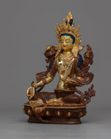 Accept the grace of the Religious Green Tara Statue, which represents compassion and protection. This exquisite statue is 22cm tall and 15cm wide, with a copper body adorned with the radiant beauty of 24k gold plating.