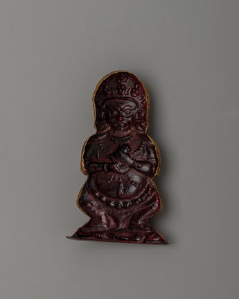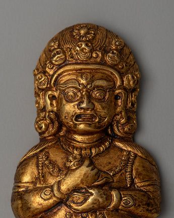 This 10cm tall and 6.5cm wide Mahakala statue has been carefully handmade from excellent copper repousse and finished with electro-gold plating, giving it both a beautiful visual appeal and spiritual meaning. Mahakala, a protector deity in Tibetan Buddhism, represents the ability to conquer obstacles, protects against negative energies, and provides a sacred presence in your house or meditation place. The electro-gold plating strengthens the statue's spiritual potency, making it an effective tool for rituals, prayers, and spiritual development. This statue is more than simply a beautiful piece; it is a genuine sign of divine energy that brings blessings of protection and courage.