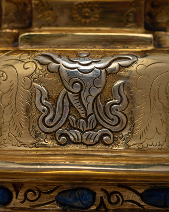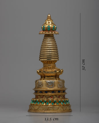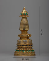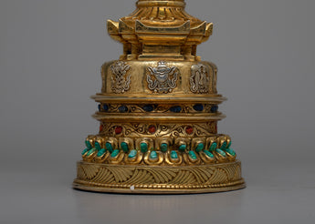 Presenting the Copper Eight Auspicious Symbol Stupa, a heavenly manifestation of auspiciousness and spiritual blessings. This beautiful 30cm-tall stupa, embellished with exquisite 24k Gold Plating and handcrafted with great care on a Copper body, exudes sacred meaning and divine grace.