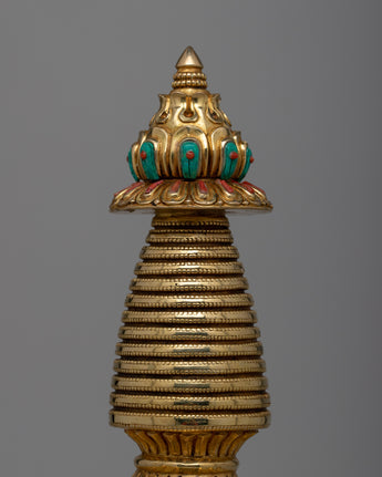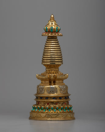 The eight auspicious symbols in Buddhist tradition are known for their profound significance and eternal beauty, which are showcased in every detail of the stupa that has been carefully built by talented artisans. Stupa, adorned with gemstones, represents attributes of prosperity, enlightenment, and spiritual riches.