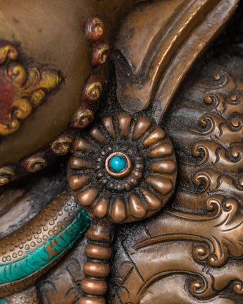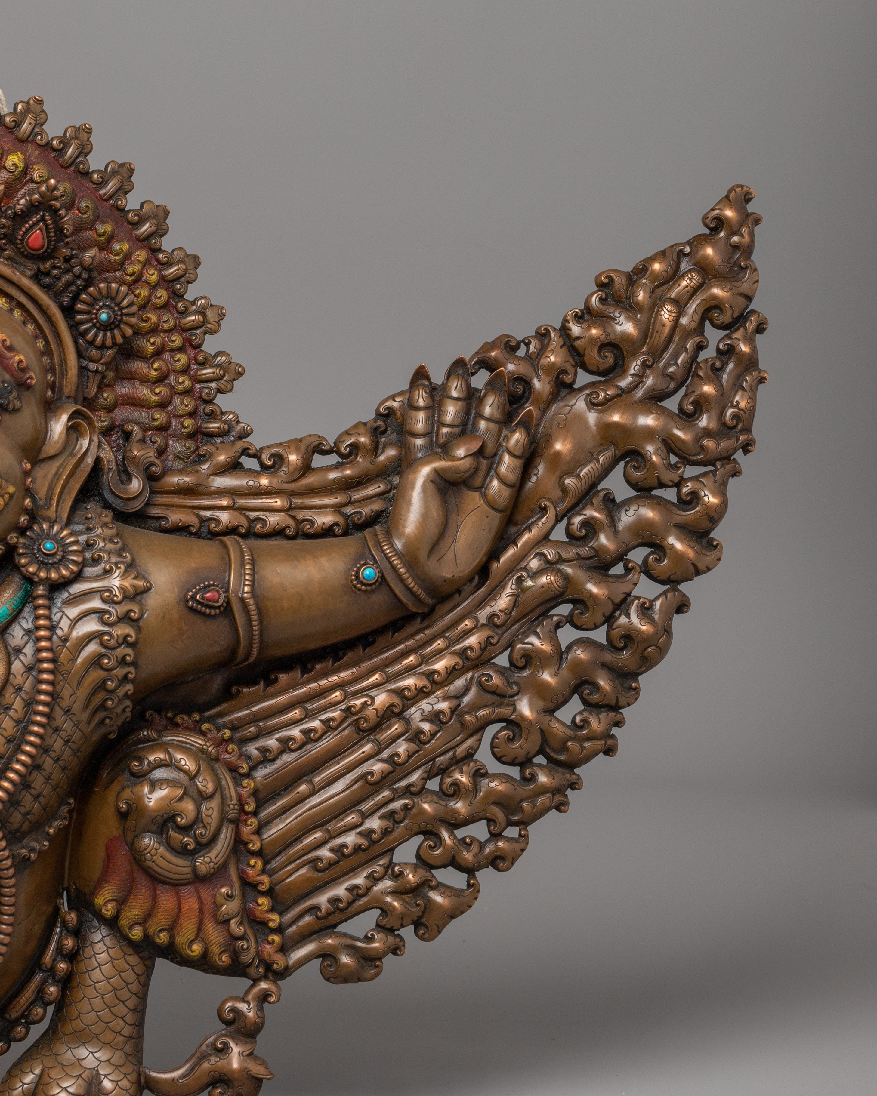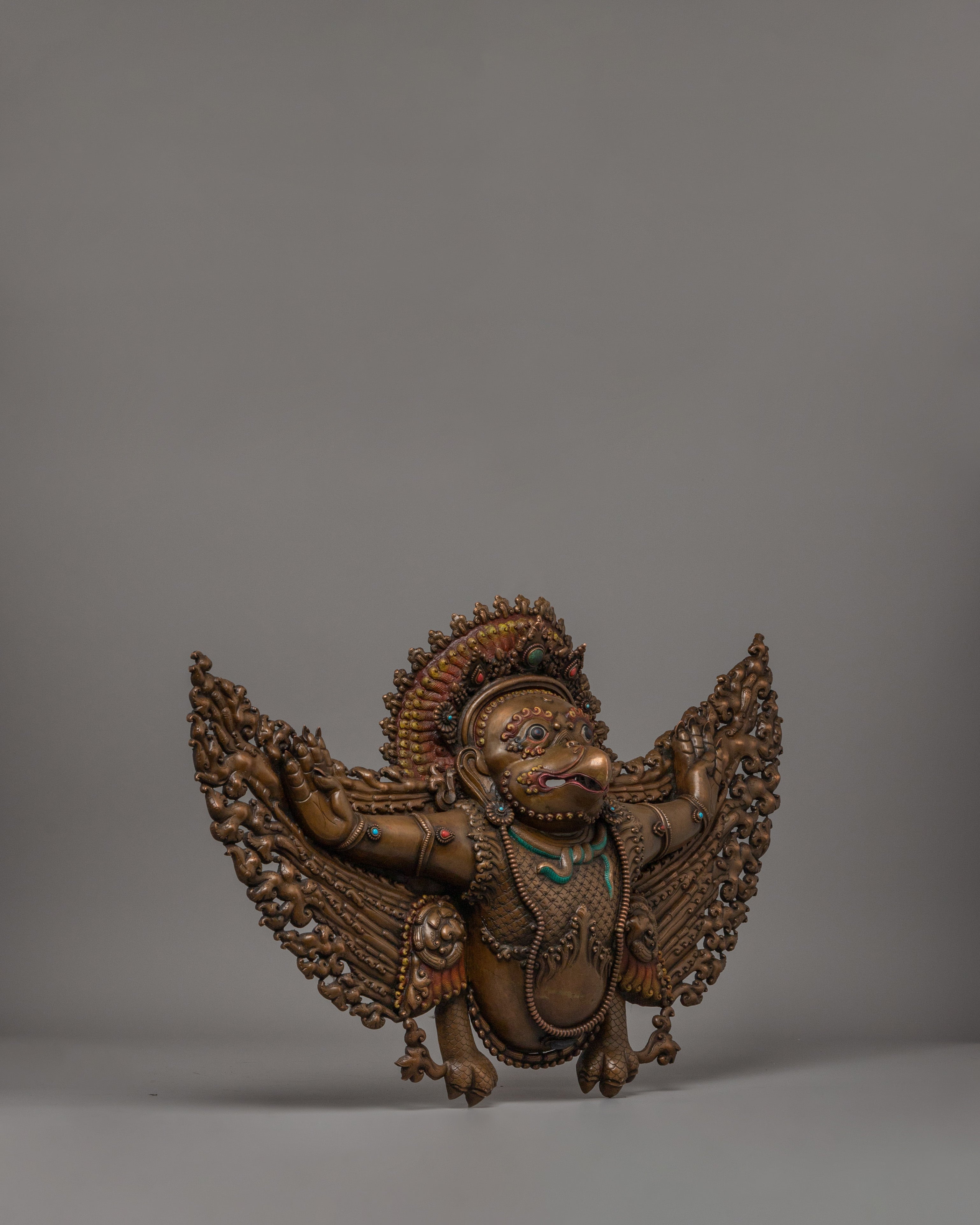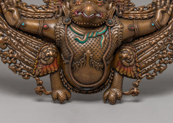 This gorgeous piece, expertly created from high-quality copper, is embellished with beautiful coral and turquoise stones, which add to its spiritual importance. The meticulous detailing, from Garuda's furious look to the beautifully spread wings, exemplifies traditional Himalayan craftsmanship.