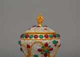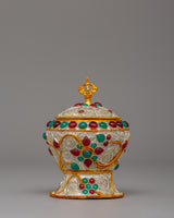 This ceremonial vessel is small and stylish, measuring 11 cm in height and 8 cm in breadth, and weighing 0.22 kilogram. In addition to being a valuable decorative item, it is perfect for holding rice or other offerings during spiritual ceremonies. This is a significant object for any Buddhist practitioner or collector of artifacts since the artificial coral and turquoise stones add to its appearance and represent protective and cleansing forces.