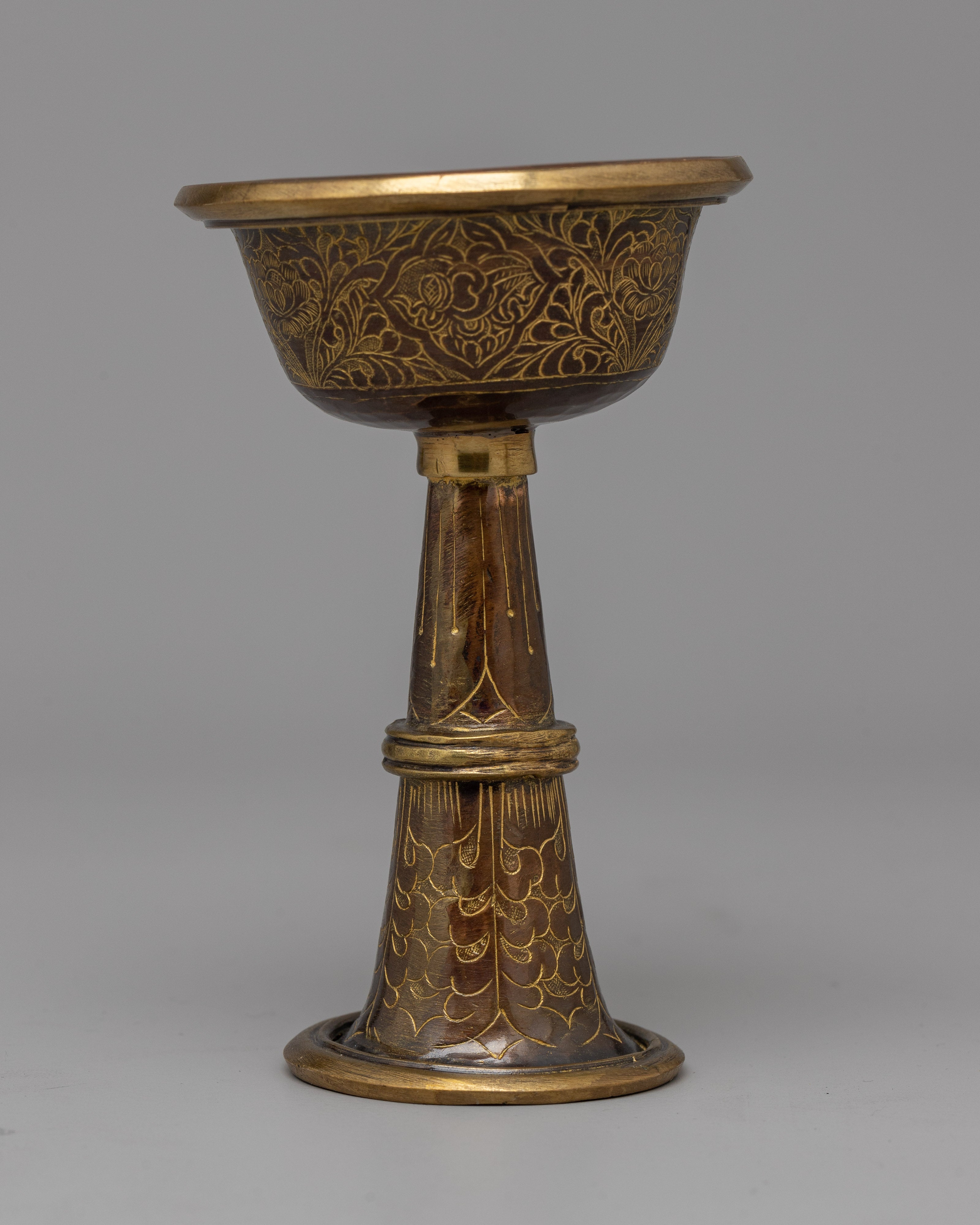 It is offered by pouring the beverage into a cup-like wine glass and placing it into a lower bowl. The beverage is poured into the cup during the offering, where the liquid overflows into the lower bowl. The symbol of the overflowing liquid is highly auspicious because it represents an abundant flow of merits.