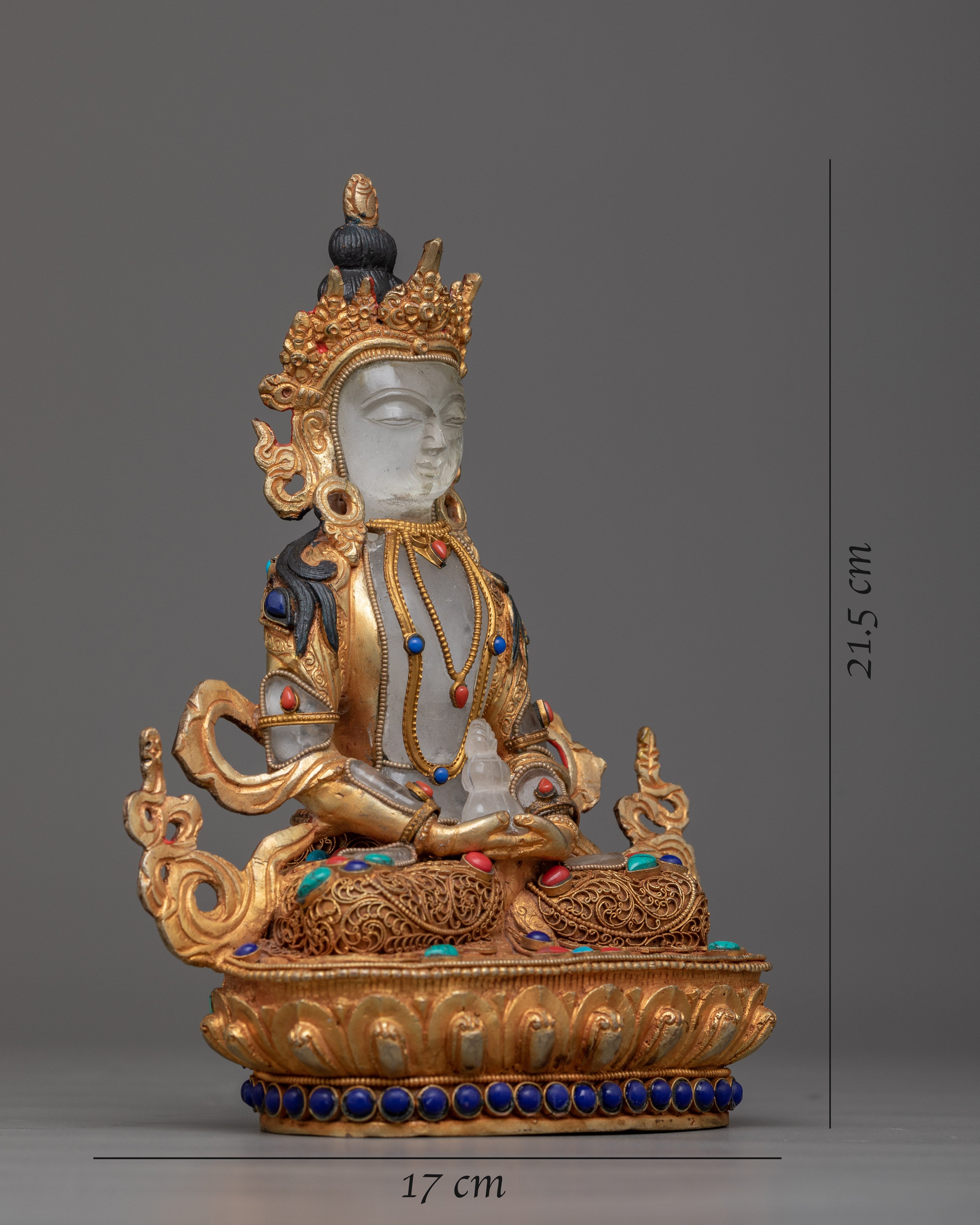 Introducing the exquisite Crystal Amitayus Statue, a fusion of the opulence of 24k gold-plated copper and the natural beauty of crystal. This statue is a captivating addition to your spiritual sanctuary because it captures the essence of divinity and longevity.