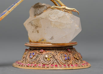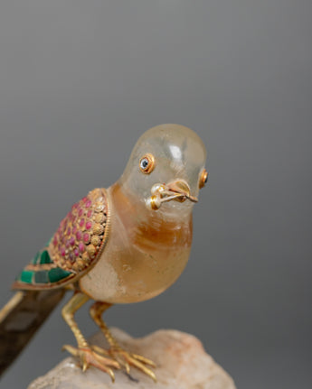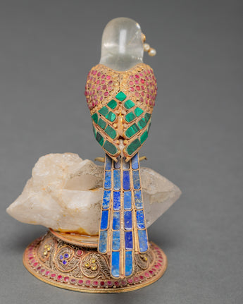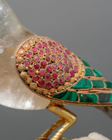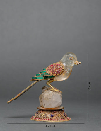 The Bird is portrayed left sight view carrying fruit in white color. Bird mounted on a Crystal Stone supported for bird feet with a Copper base. The bird is with paste glass stones. The bird's beak, feet, wings, and tail are 24k gold plated. At the tails of the birds, there is the use of blue crystals used to make them more attractive.  This bird has a lovely crystal body. The wings are infilled with green gemstones and red gemstones. The circular base is elaborately decorated with gemstones. These Birds set will add a fresh, modern accent to your home decor. Ideal for gifting and a must for collectors.
