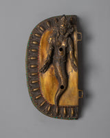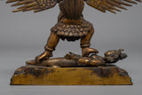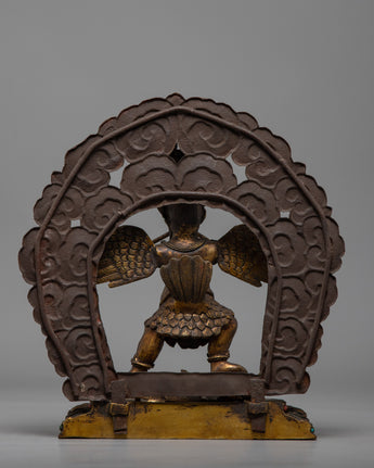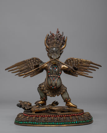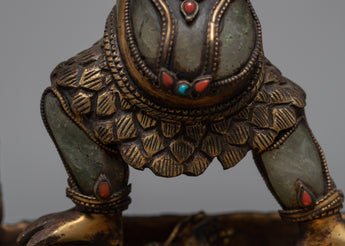 Our Crystal Garuda statue is made of copper with gold platings. It is finished with an antique oxidization process. The statue is then decorated with medium-quality stones to give it a charming appearance.