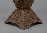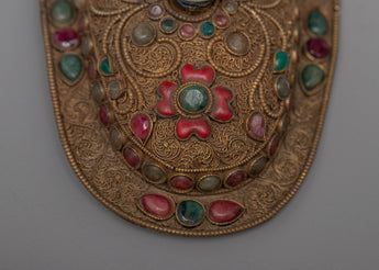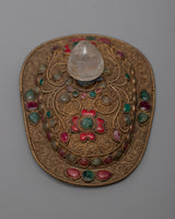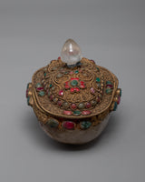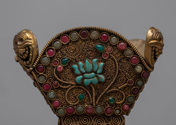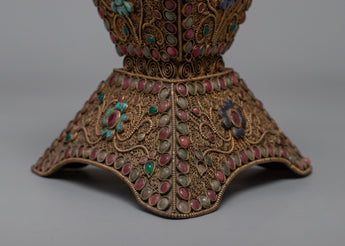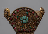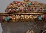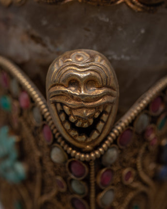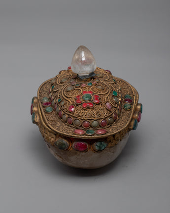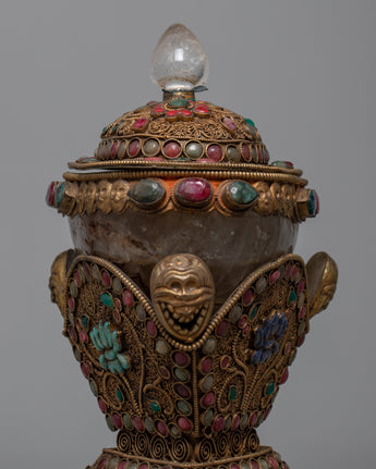 Our Crystal Kapala is completely hand-hammered from copper. The cup's top is composed of crystal and was created utilizing the Seku metal wire process. Emerald, Ruby, Emitted Coral, and other green stones are among the semi-precious stones that decorate Kapala.