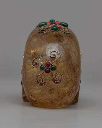 Uncover the mystique of our Crystal Skull, an alluring work of art crafted from genuine crystal stone. This exquisite sculpture fuses elegance and spirituality in a singular way by fusing the raw, unadulterated beauty of crystal with the artistry of copper and silver wiring.