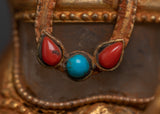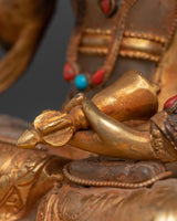 Vajrasattva is depicted with a bell in his left hand at the level of his hip and a Vajra in his right hand at his chest, with gold plated. High-quality stones are set and crafted on the face and Vajrasattva Body. The base of the statue is copper base with gold plated. His robes are filigreed with inlays of carved lapis lazuli, coral, and turquoise. The bell symbolizes wisdom, and the vajra represents compassion. He sits serenely with legs crossed upon a moon disc atop a lotus seat.