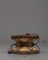 The damaru is a respected instrument in Tibetan Buddhism and Hindu tantric practices, and it is often employed in ceremonies and chanting to produce rhythmic tones that promote meditative regions and spiritual focus. The skull designs stress the fleeting nature of life, which is consistent with Buddhist beliefs. This damaru, meticulously produced by expert artisans, blends creativity, symbolism, and spiritual value, making it an absolute must-have for practitioners, collectors, or everyone looking for a significant addition to their spiritual practice.