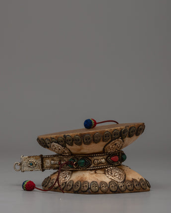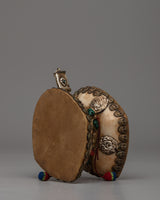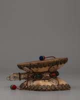 A Chod drum, integral to the Chod spiritual practice in Tibetan Buddhism, is a unique and symbolic instrument. Also known as a damaru, this small, double-sided hand drum has a narrow waist connecting two drumheads. The drum's shape is often likened to the hourglass, embodying the union of wisdom and compassion. Used by Chod practitioners during ritualistic ceremonies, the drum's rhythmic beating is believed to connect with the sacred energies, facilitating meditation and the realization of emptiness. The Chod drum, with its ritualistic role, underscores the synthesis of sound, spirituality, and meditation in Tibetan Buddhist traditions.