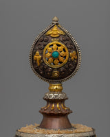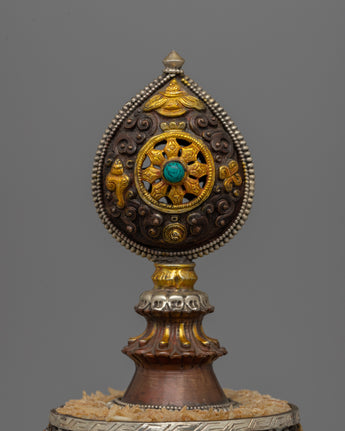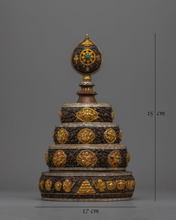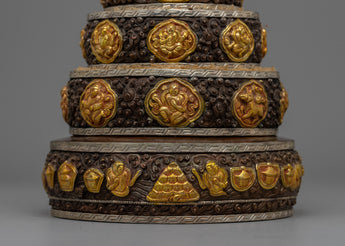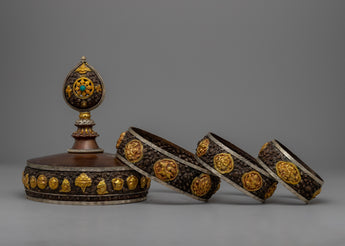 The Decorative Buddhist Mandala Offering Set is a stunning work of art made of oxidized copper, demonstrating a masterful balance of durability and grace. This set, enhanced with electro gold and silver plating, reflects light beautifully, providing a dazzling effect that catches the eye. This offering set, measuring 15 cm in height and 17 cm in width and weighing 0.75 kg, is the right size to serve as both a decorative piece and a functional element of your spiritual practice.