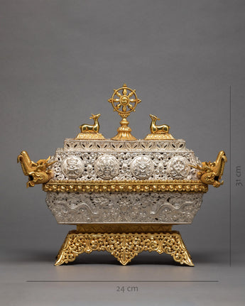 The burner is embellished with golden dragons on either side, representing protection, strength, and good fortune. Buddhism frequently uses dragons as symbols of care over sacred areas or artifacts. The body is adorned with Buddhist symbols that reflect auspicious qualities such as wisdom, compassion, and protection. The Dharmachakra (Wheel of Dharma), an essential symbol of the Buddha's teachings, stands atop the burner. The wheel is flanked by two deer, referencing the Buddha's first lecture at Deer Park in Sarnath, where he taught the Dharma and started it in motion.