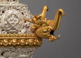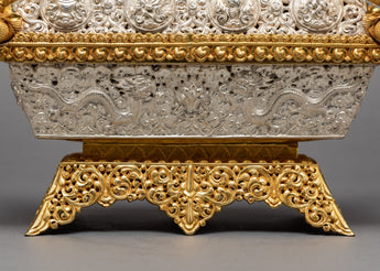 The incense burner is made of copper, which is solid and malleable, making it excellent for delicate crafting. It is beautifully coated in 24k gold and silver, giving it a luxury and religious aspect. In Buddhist culture, gold and silver are frequently connected with purity, spiritual prosperity, and the importance of the Buddha's teachings. The dual-tone finish enhances the piece's visual attractiveness while indicating its spiritual significance.