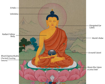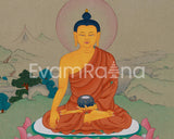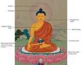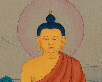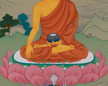 The Dharma Teacher Shakyamuni Buddha Painting is a hand-painted thangka by Enlightenment Studio, depicting the historical Buddha, Siddhartha Gautama, at the moment of his great awakening. The painting is created using natural stone colors and 24K gold. The radiant yellow hue of the Buddha's body, achieved through the use of Himalayan mineral pigments, reflects spiritual illumination and compassion. The hand-applied gold enhances the soft halo, intricate monastic robes, and serene landscape details.