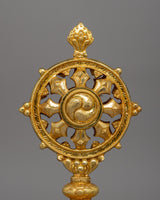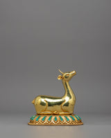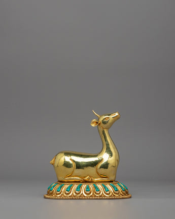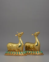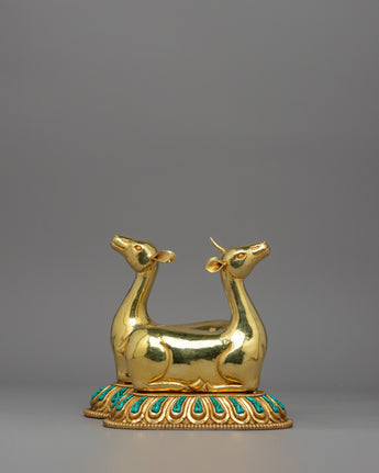 Two gold-plated deer flank the Dharma Wheel and are deeply symbolic in the Buddhist tradition. The deer represents the Buddha's first discourse in Deer Park in Sarnath when he started the Wheel of Dharma in action. Their soft and tranquil demeanor reflects receptivity, patience, and dedication to the Buddha's teachings. In Buddhist tradition, deer represent peace and the inherent joy that comes with spiritual awakening. Placing the Dharma Wheel and Deer Set at a Buddhist shrine or meditation room promotes inner serenity, mindfulness, and dedication to the path of enlightenment.