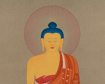 Discover the serene essence of Dhyani Buddha Shakyamuni in this exquisite meditation Thangka, a masterpiece of Tibetan Buddhist artwork. Hand-painted with meticulous detail, this Thangka captures the tranquil demeanor of Shakyamuni Buddha, the meditative pose emphasizing his enlightened state. Adorn your sacred space with this spiritual artwork, crafted on traditional Tibetan silk, embodying centuries of Buddhist artistic tradition. Perfect for meditation rooms or as a focal point in any spiritual setting, it invites contemplation and inner peace. Illuminate your surroundings with the divine presence of Dhyani Buddha Shakyamuni, symbolizing wisdom, compassion, and the path to enlightenment in Tibetan Buddhist philosophy.