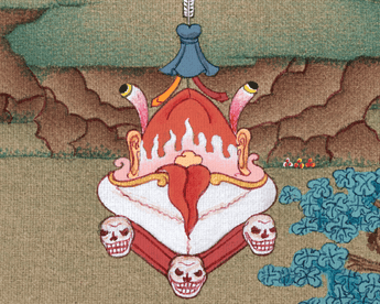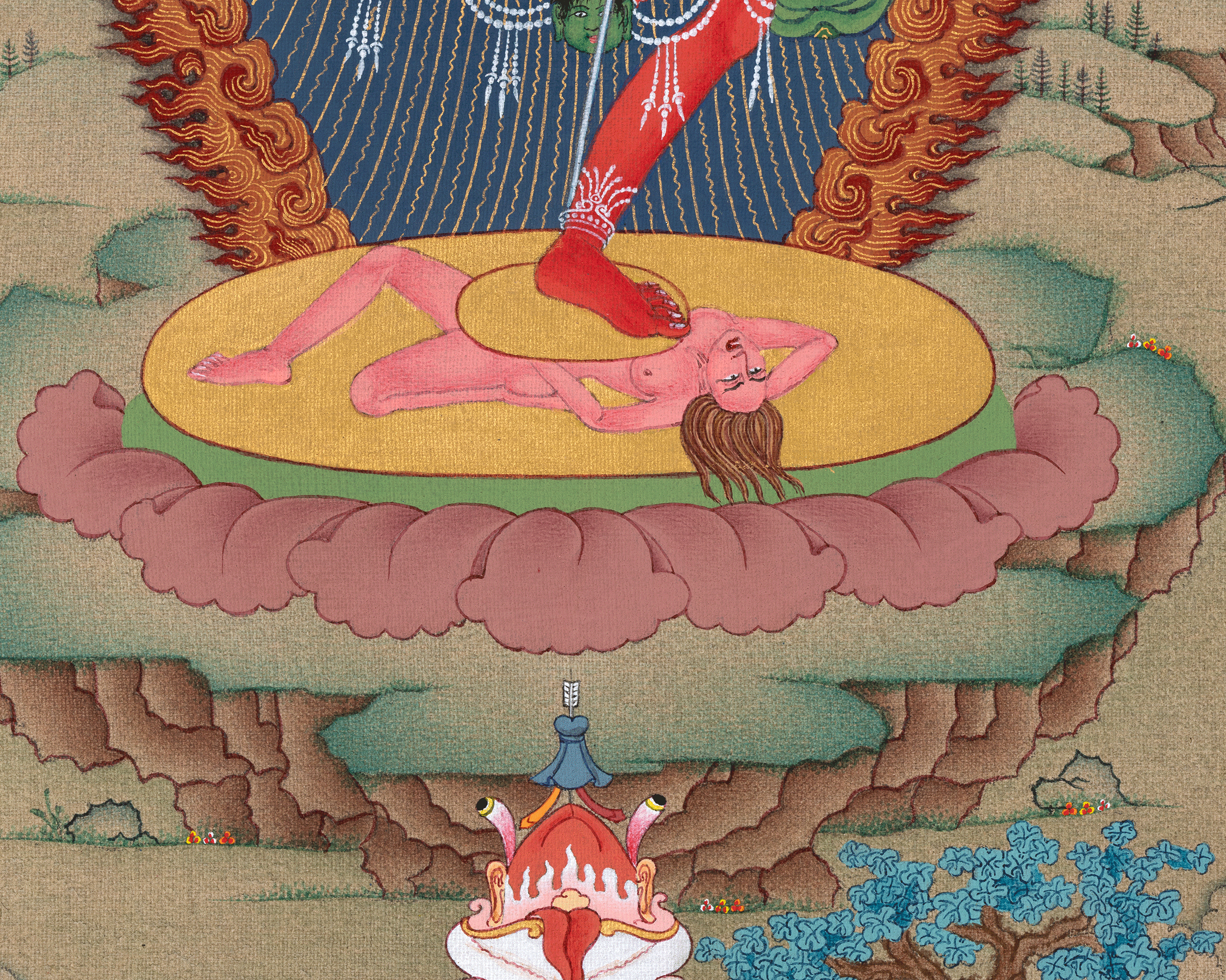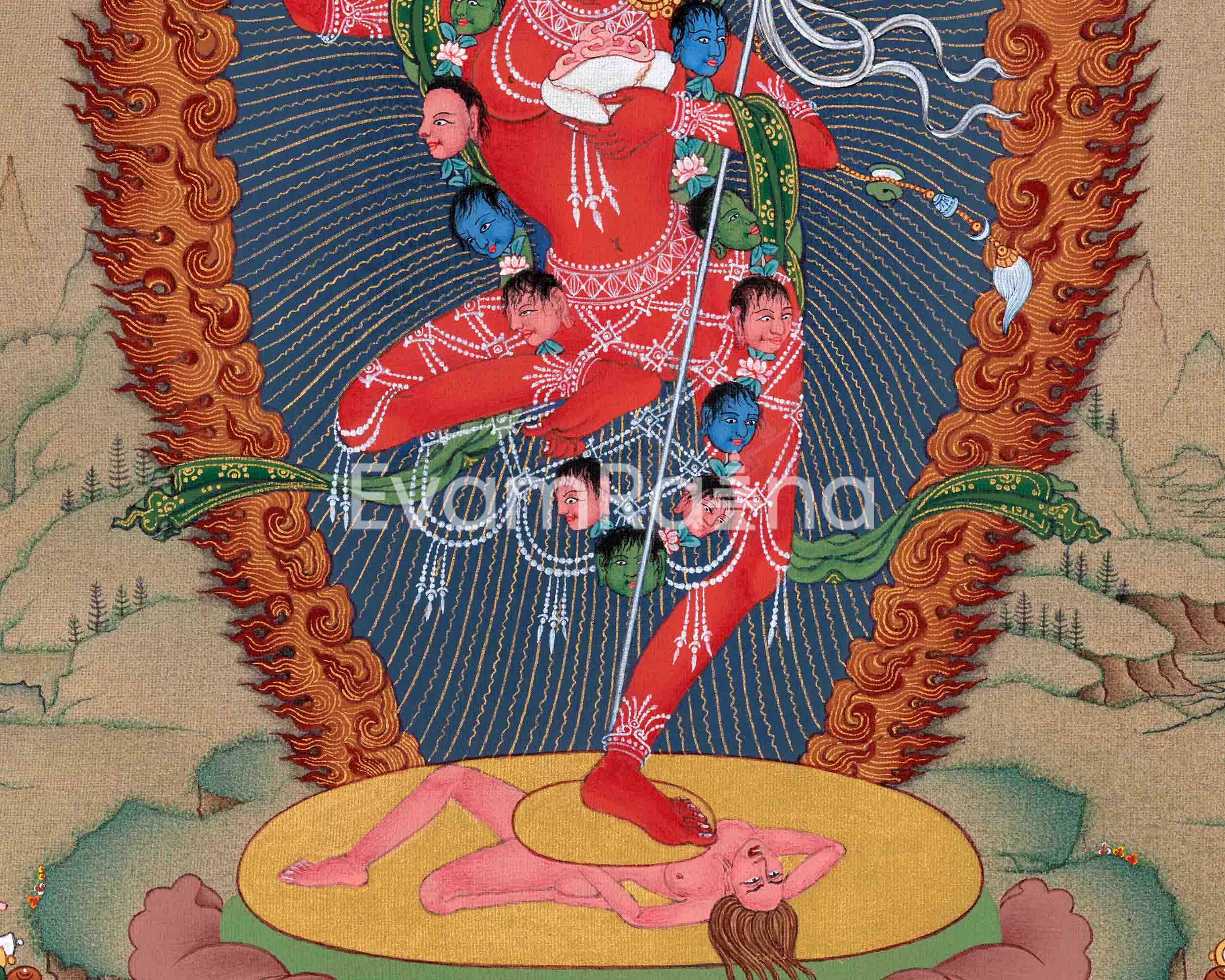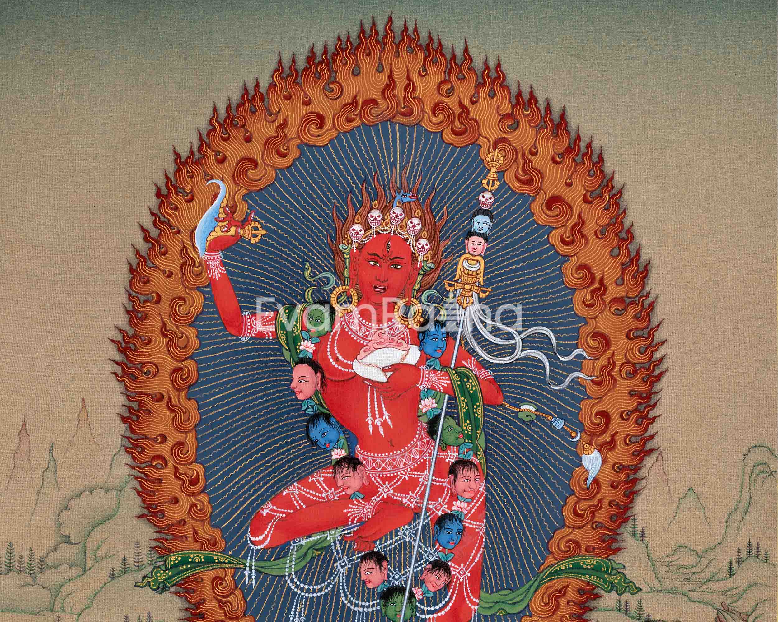 Renowned in Tibetan Buddhism, Vajravarahi represents female wisdom and the victory over ignorance.Her representation in the thangka symbolizes the conversion of passion into wise and compassionate action. She is frequently seen dancing on obstacles and sporting a sow's head.