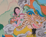 Dorje Drolo is portrayed in a dynamic, wrathful pose, seated upon a roaring tigress, indicating his mastery over ignorance and primal fears. He carries a vajra in one hand, indicating indestructible wisdom, and a ritual dagger (phurba) in the other, symbolizing his power to cut through negativity and impediments. His garland of human skulls symbolizes the transcendence of ego and mortality, while the flames in his halo represent transformational force and heavenly protection. This thangka is a powerful addition to meditation spaces or sacred collections, providing spiritual strength and protection.