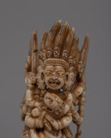 Introducing the handcrafted Dorje Phurba Vajrakilaya Statue represents the profound spiritual legacy and precise artistry of Tibetan handicraft. This magnificent monument, crafted from ethically sourced buffalo bone, perfectly embodies the fierce and guardian spirit of Vajrakilaya, the angry god renowned for his capacity to eliminate obstacles and bad energy. The exquisite craftsmanship and intricate design reflect homage to the deity's profound cultural and spiritual significance in Tibetan Buddhism.