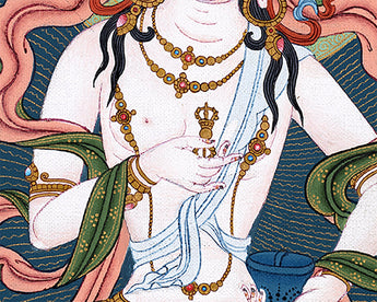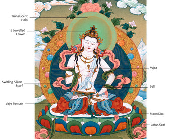 Vajrasattva holds a bell in his left hand and a Vajra in his right hand. The bell represents wisdom, while the vajra represents compassion. He sits serenely on a moon disc atop a lotus seat, his legs crossed, symbolizing that he remained in this impure cycle of samsara for the sake of sentient beings while remaining unblemished by its flaws. Vajrasattva is a purification-focused meditational Bodhisattva deity who is worshipped by Vajrayana Buddhists of all sects. According to the scriptures, repenting to Vajrasattva and singing his hundred-syllable mantra can cleanse one of all sins and obscurations. One of the four preparators of ngondro, a preparatory but necessary practice in Vajrayana Buddhism, is the Vajrasattva cleansing ceremony.