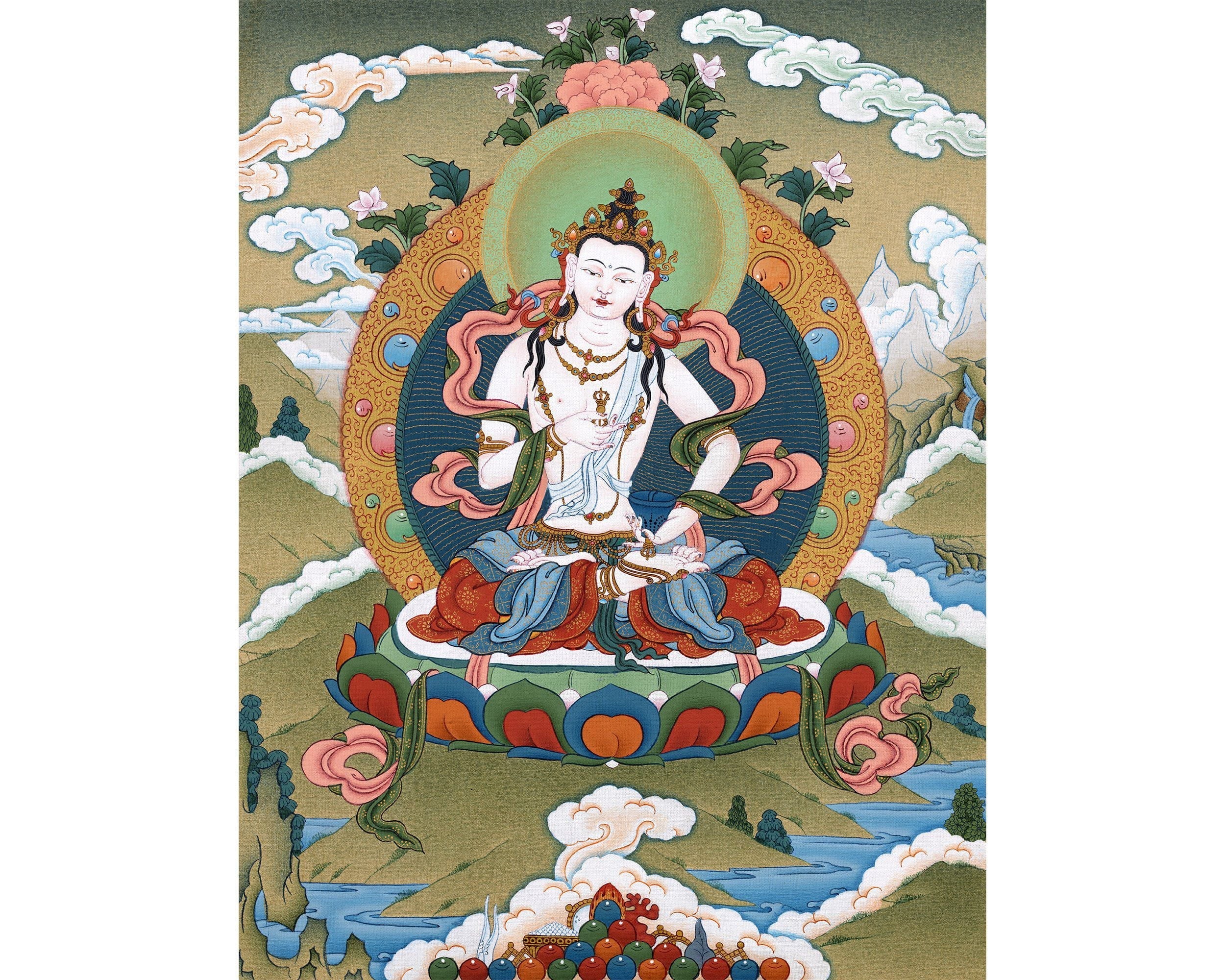 Note: Vajrasattva Thangka is an original painting from Enlightenment Studio located at Boudha Stupa.