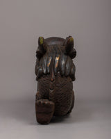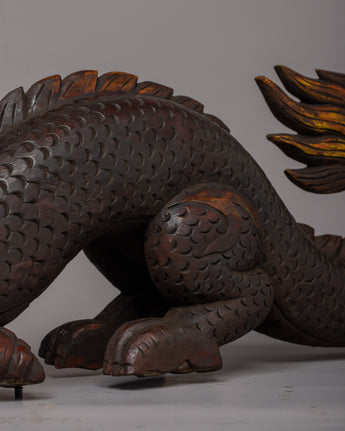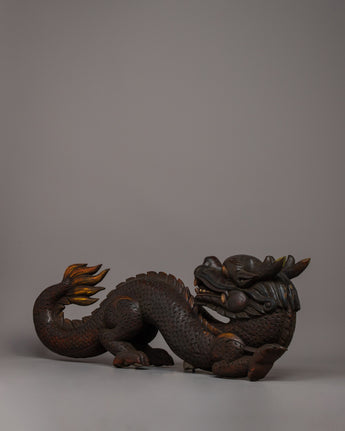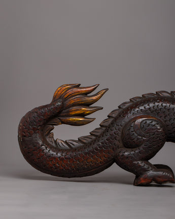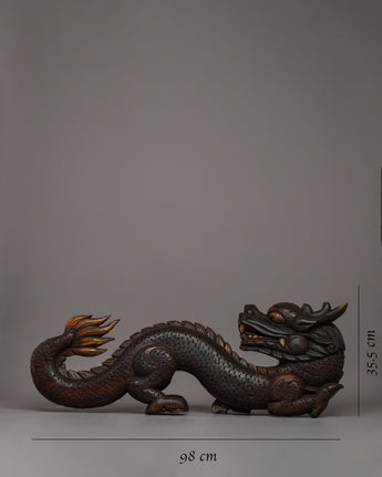 Feel the imposing presence of our gorgeously hand-painted and painstakingly made wooden dragon statue. This magnificent artwork is sure to turn attention as a centerpiece at 35.5 cm in height, 98 cm in width, and 11.04 kg in weight.