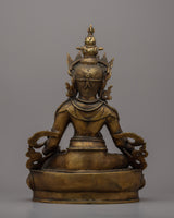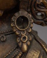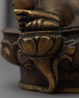 This handcrafted antique-style Dzambhala statue is made of brass and has an antique appearance. The deity is seen seated on a lotus base, one hand holding a fruit and the other a mongoose. The statue is meticulously detailed, down to the jewelry and the expression on the face. This lovely artwork is ideal for anyone looking for a traditional and authentic addition to their spiritual collection.