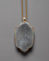 Our lovely handcrafted pendant is silver and gold plated. It's decorated with exquisite coral and turquoise stones. The Deity is carved right in the center of the pendant, giving it religious overtones.