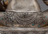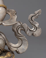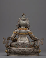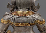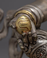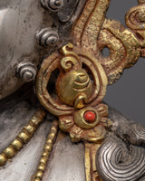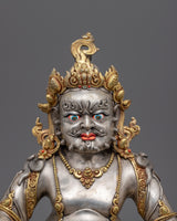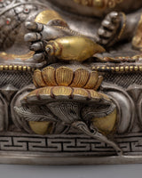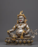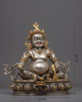 The Dzambhala statue is made of copper, which is a sacred metal in Buddhist culture. The statue is adorned with silver and gold plating, which are also considered auspicious metals in the Buddhist tradition. The statue typically depicts Dzambhala holding a mongoose in one hand and Criton Fruit in the other. The mongoose symbolizes generosity and the ability to turn negative situations into positive ones, while the bowl of jewels represents wealth and abundance.