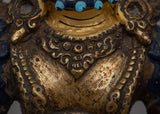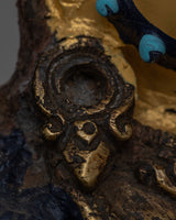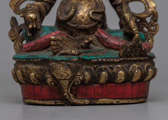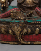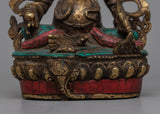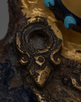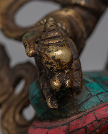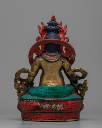 With its delicate inlay of turquoise and coral stones, the statue exudes a sense of spiritual grace and sacred beauty. Every stone has been carefully positioned to enhance the statue's golden glow, resulting in a pleasing fusion of hues that represent the abundance of both material and spiritual riches. The Dzambhala Sadhana Statue inspires practitioners to develop generosity, appreciation, and spiritual riches in their life by acting as a potent reminder of the abundance that exists in the universe, whether it is positioned in a meditation area or as the center piece of a revered altar.