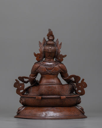 This statue, expertly fashioned from high-quality oxidized copper, has a timeless appearance, highlighting the delicate details of Dzambhala's powerful shape. The oxidation technique gives the sculpture a distinct and deep patina, which complements the image of Dzambhala, who is known for bestowing prosperity and financial stability. The statue's substantial height and weight make it an impressive addition to meditation spaces, home shrines, or as a focal point in areas dedicated to financial prosperity and spiritual growth.