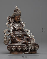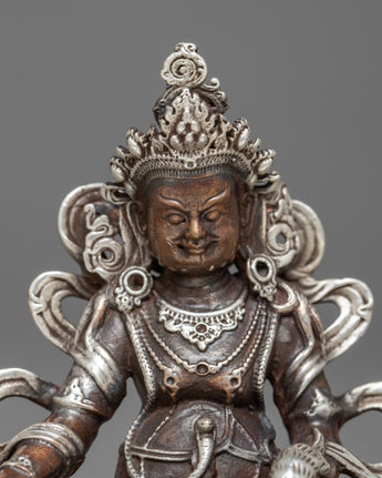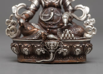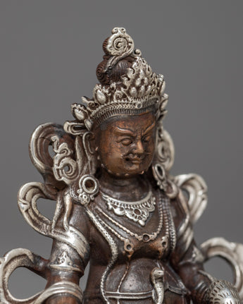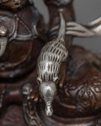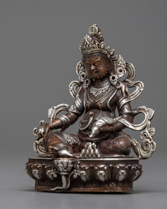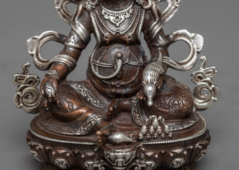 Introducing our amazing Dzambhala Wealth Deity Statue, a representation of prosperity and abundance. This statue, which is meticulously crafted with a silver coating and an oxidized copper body, perfectly embodies Dzambhala's blessings. The figurine is 9 centimeters tall and is carefully crafted, embodying the divine attributes of plenty and giving.