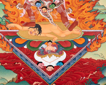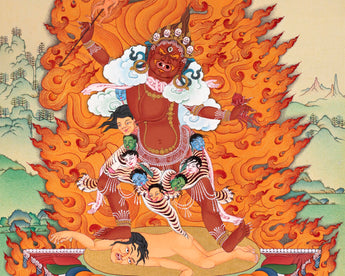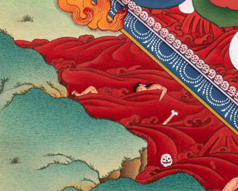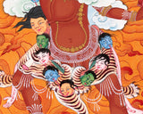 This thangka depicts Ekajati, also known as Vajra Tara, in the Karma Gadri style, with natural stone colors and 24k gold. She's standing on a triangle flame mandala adorned with a garland of human skulls and snakes. Her golden hair is pulled back into a single bun, and she has a turquoise forehead curl. She waves a human body impaled and stands upright with her right hand. The eviscerated, dripping red heart of those who have betrayed their Vajrayana vows is held in her left hand.