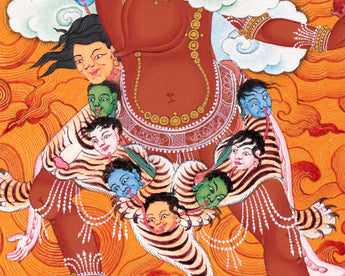 In Vajrayana Buddhist mythology, Ekajati is one of the most strong and fearsome protectors. According to Tibetan tradition, the tantric master Padmasambhava pierced her right eye to help him subdue Tibetan demons more effectively. "Blue Tara," "Vajra Tara," and "Ugra Tara" are all names for Ekajati. Along with Rahula, she is often regarded as one of the Nyingma school's three main protectors. In the Green Tara mandala, she usually appears as a liberator. Her ascribed abilities also include reducing adversaries' fear, sharing joy, and eliminating personal obstacles on the path to enlightenment.