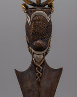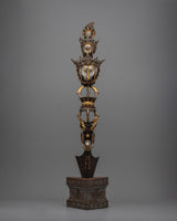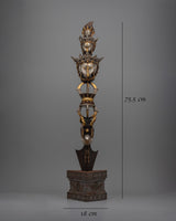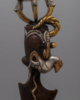 The exquisite gold and silver plating on the Phurba pays attention to the traditional Tibetan practice of creating ritual objects. This ceremonial dagger is both a useful tool and a stunning ornament. It is frequently used in spiritual activities to drive out evil spirits. Its impressive aura is enhanced by its exquisite finish and significant weight, rendering it an invaluable addition to any collection or sacred area. The graceful Tibetan phurba is a representation of Tibet's rich cultural legacy as well as a sign of strength and defense.