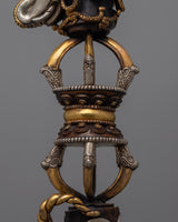 This stunning piece, the Elegant Tibetan Phurba, displays the wonderful craftsmanship of traditional Tibetan handicraft. Made with a copper body and plated in silver and gold, this Phurba has a height of 7.5 cm and a large base that measures 18 cm. With a weight of 6.40 kg, it is imposing and represents both artistic grace and spiritual significance.