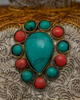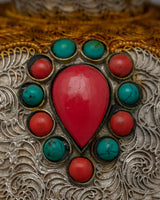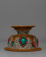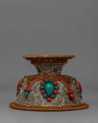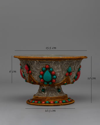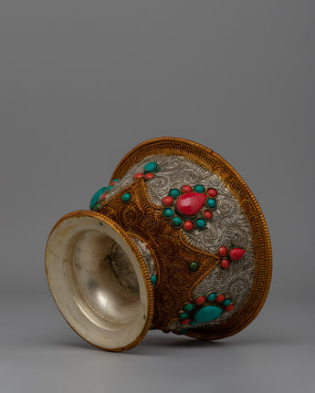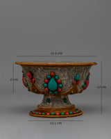 The Elegant Lapis Lazuli & Coral Adornments Offering Bowl Set blends tradition and artistry, with a copper body and electro gold plating that conveys timeless elegance. Each bowl is adorned with wealthy, artificial lapis lazuli and coral stones, highlighting the piece's shades and spiritual significance. These offering bowls, measuring 10 cm in height and 15.5 cm in diameter, have an establishing yet elegant presence that makes them ideal for use in religious ceremonies as well as decorative settings. The thoughtful gold plating gives each bowl a bright, shiny appearance, while the lapis lazuli and coral accents add a subtle, vibrant contrast.