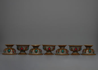 These bowls have been created to perform more than just visual appeal; they represent simplicity, wisdom, and abundance in Buddhist offerings. Each bowl's 6 cm inner depth provides for a wide range of offerings, whether utilized for ceremonial purposes or simply as a sign of prosperity in your residence. With a width of 10.3 cm, these bowls are both utility and symbolic, and their excellent electro gold plating ensures durability and a stunning finish that will remain.