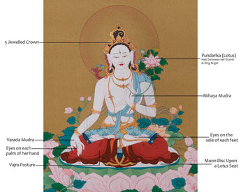 In Tibetan Buddhism, White Tara is a revered female deity known for her compassion, healing, longevity, and protection. The thangka shows her in a vajra posture on a lotus throne, symbolizing purity and enlightenment. Her right hand is positioned in the Varada Mudra, signifying the offering of blessings and compassion. Meanwhile, her left hand, held at her heart in the Abhaya Mudra, cradles a blooming pundarika (lotus) between her thumb and ring finger, representing her wisdom and spiritual purity. White Tara is adorned with a five-jeweled crown, golden ornaments, and silk scarves. Her seven eyes symbolize her omniscient awareness, enabling her to perceive the suffering of beings across all realms and respond with motherly compassion.